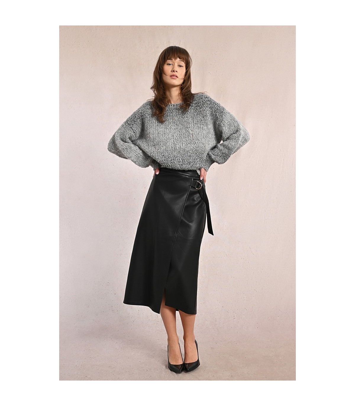 Moderni ja elegantti musta keinonahkainen hame sopii sekä töihin että juhlatilaisuuksiin. Korkea vyötärö ja epäsymmetrinen leikkaus koristeellisella soljella antavat hameelle erityisen ilmeen.