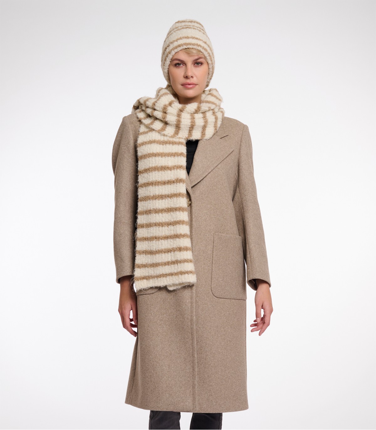 Pehmeä ja lämmin huivi on mukava ja suojaa kylmältä säältä. Raidallinen kuvio ja neutraalit sävyt sopivat hyvin erilaisten takkien ja jakkujen kanssa. Huivi on valmistettu miellyttävän pehmeästä ja lämpimästä materiaalista.