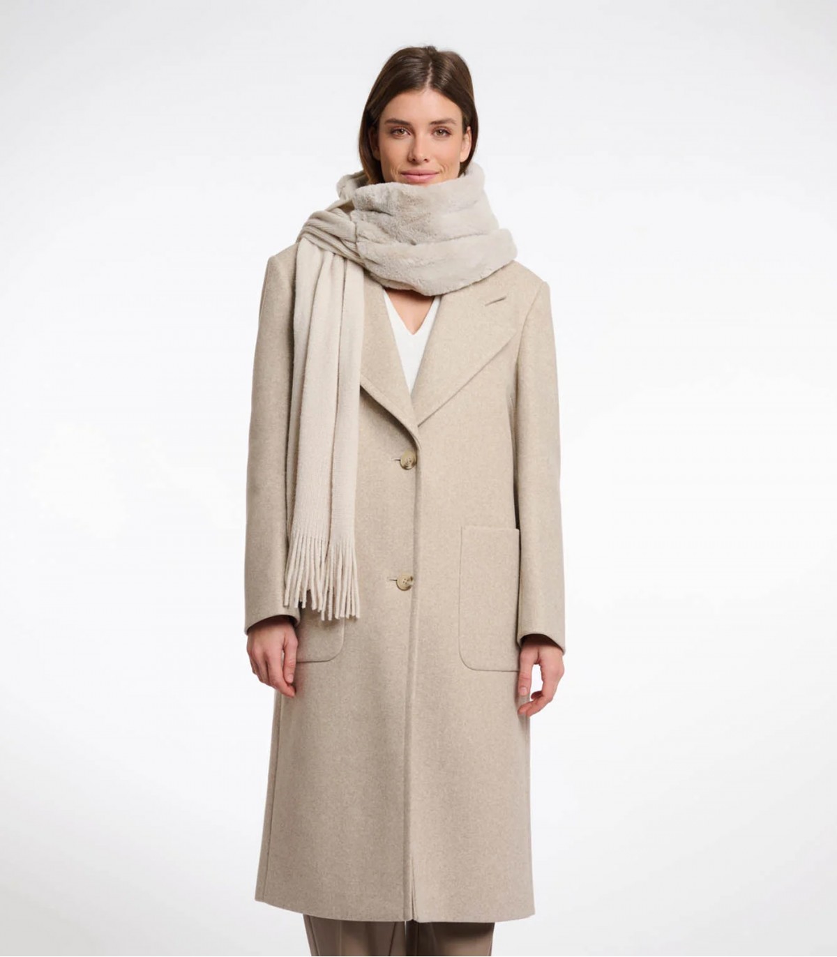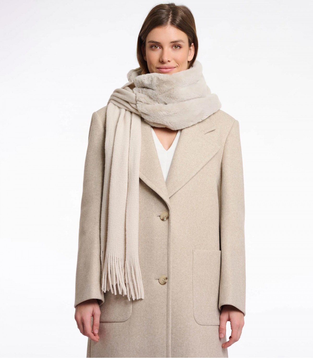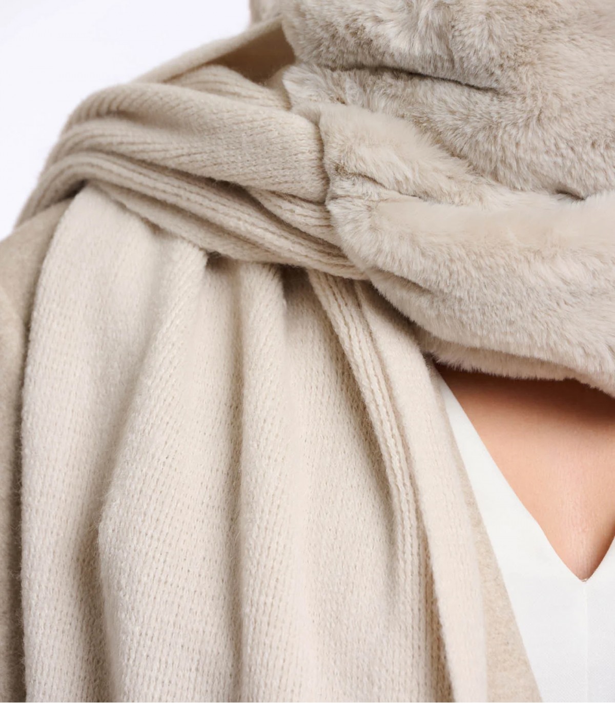 Pehmeä ja mukava naisten huivi, jossa on tekoturkiskeskus. Täydellinen käytettäväksi takin tai jakun kanssa kylminä päivinä.