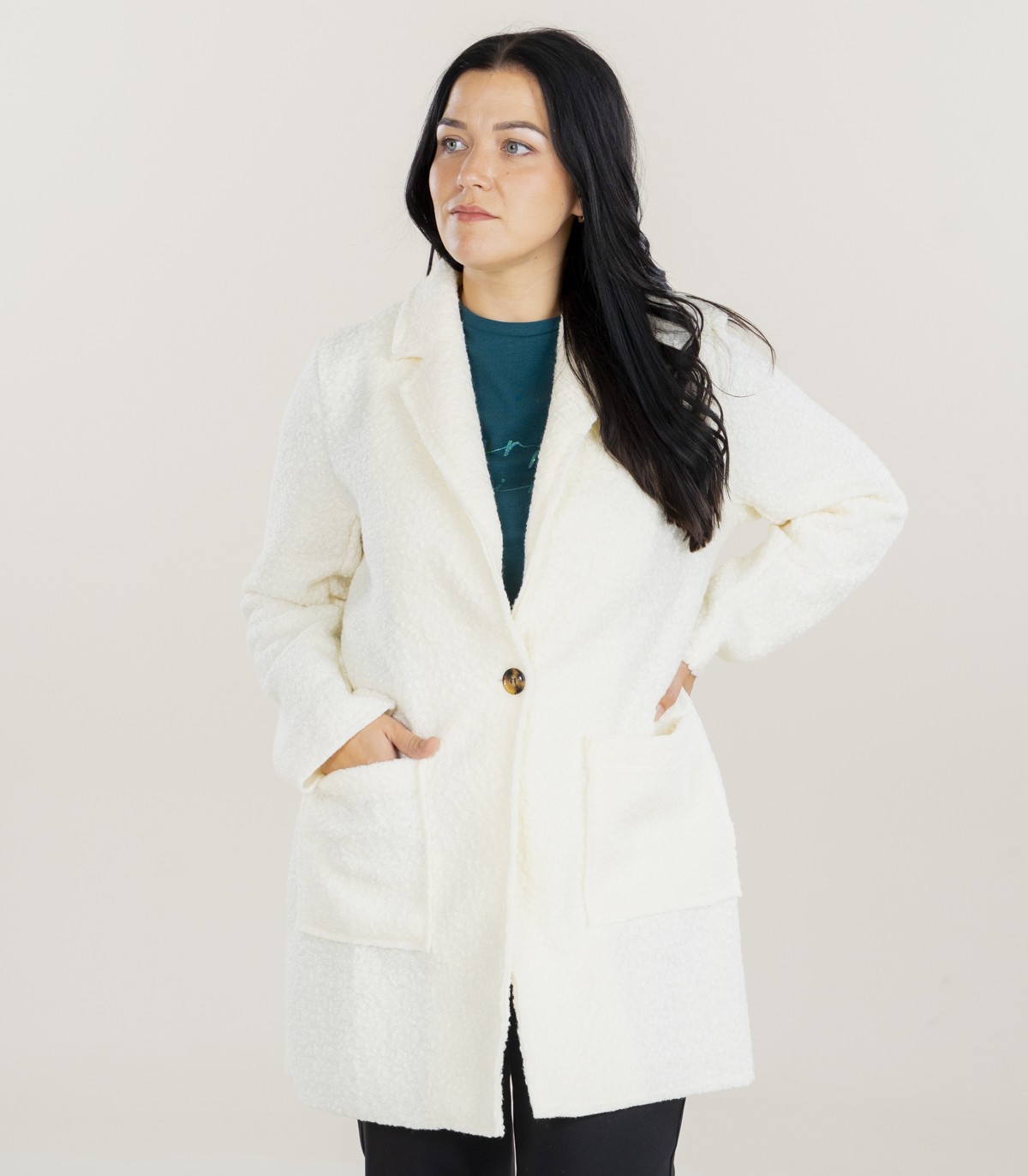 Lämmin ja mukava Zabaione-naisten takki viileämpiin päiviin. Klassinen yhdellä napilla suljettava malli, jossa on suuret käytännölliset etutaskut. Teksturoitu kangas luo näyttävän ilmeen.