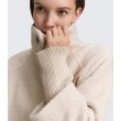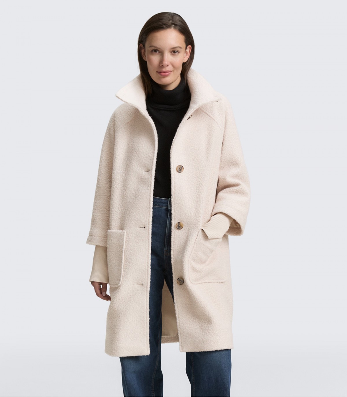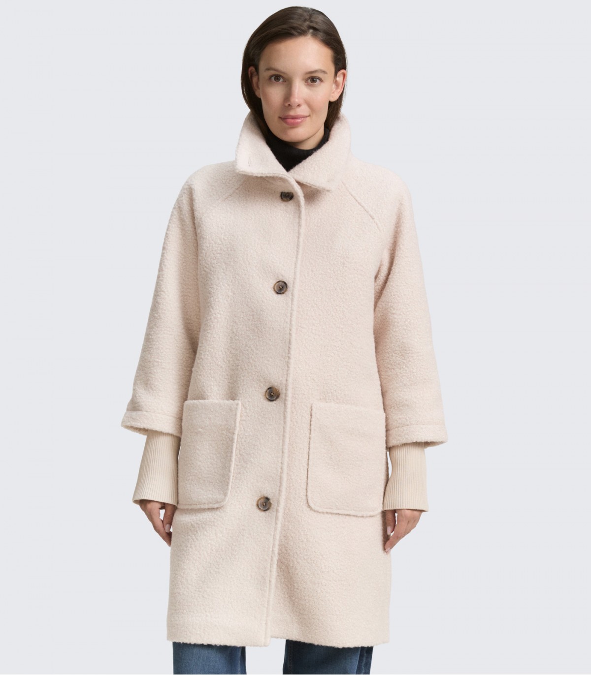 Beige bouclé-takki, jossa on korkea kaulus ja mukava suora leikkaus. Takissa on napitus edessä ja kaksi suurta käytännöllistä etutaskua.