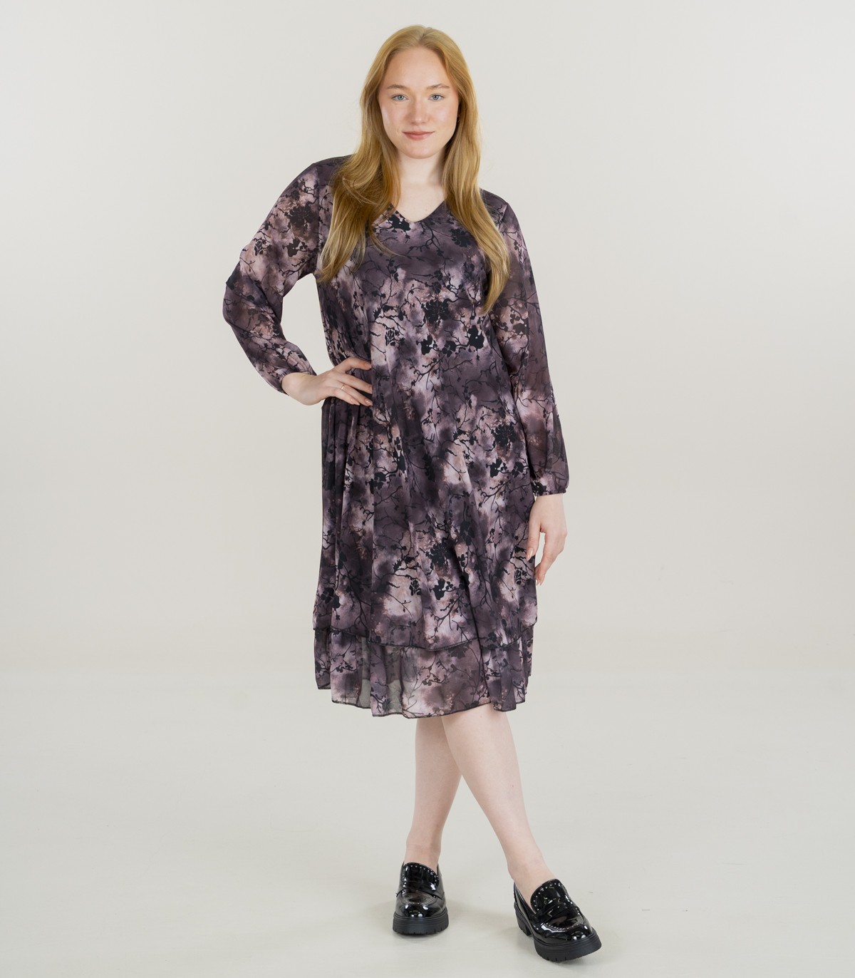Naisten mekko on kevyt ja laskeutuva, valmistettu ohuesta kankaasta ja siinä on monikerroksinen helma. Tumman taustan kaunis kukkakuvio luo naisellisen vaikutelman. Mekossa on pitkät hihat ja V-pääntie, joka lisää eleganssia yksinkertaisuuden lisäksi.