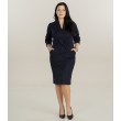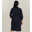 Tummansininen naisten mekko, jossa on pieni pilkullinen kuvio. Mekossa on v-pääntie, 3/4-hihat ja vyötäröä korostava solmittava vyö. Suora malli sopii sekä työhön että juhlavampiin tilaisuuksiin.