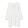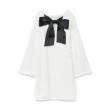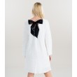 Lyhyt valkoinen mekko on koristeltu kiiltävillä paljeteilla ja koristeltu suurella mustalla nauhalla pääntiessä. Leveät hihat ja suora leikkaus tekevät siitä sopivan juhlavampiin tilaisuuksiin.