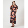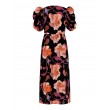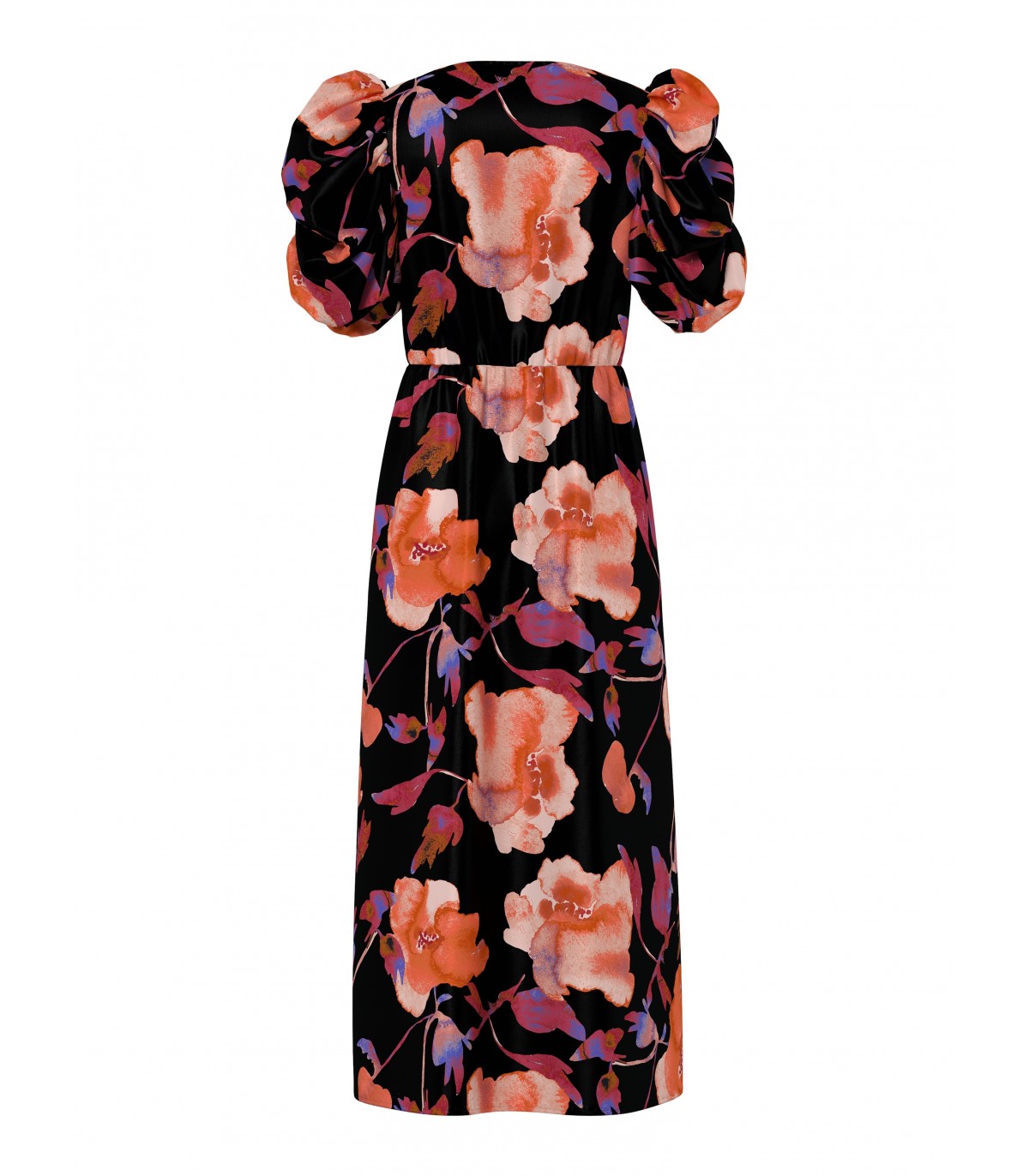 Kukkakuvioinen maksimekko, jossa on runsaat hihat ja venekaulus, näyttävässä leikkauksessa. Joustava vyötärö on mukava ja imartelee vartaloa. Mekon pituus sopii sekä muodollisiin tilaisuuksiin että tyylikkääseen arkeen.