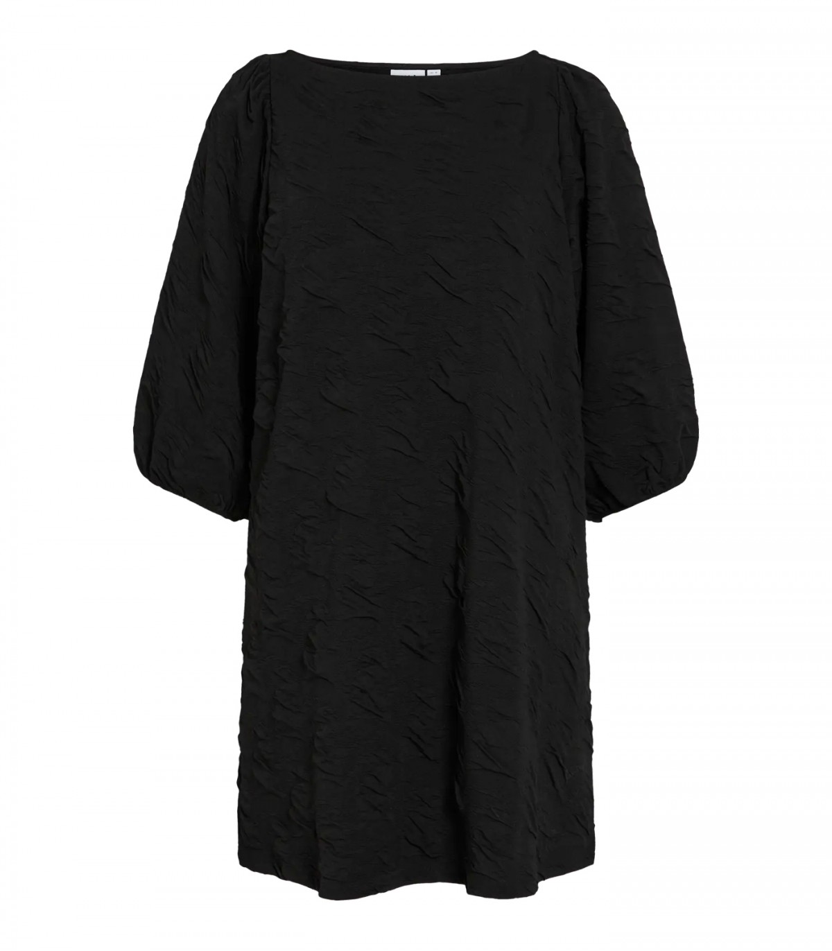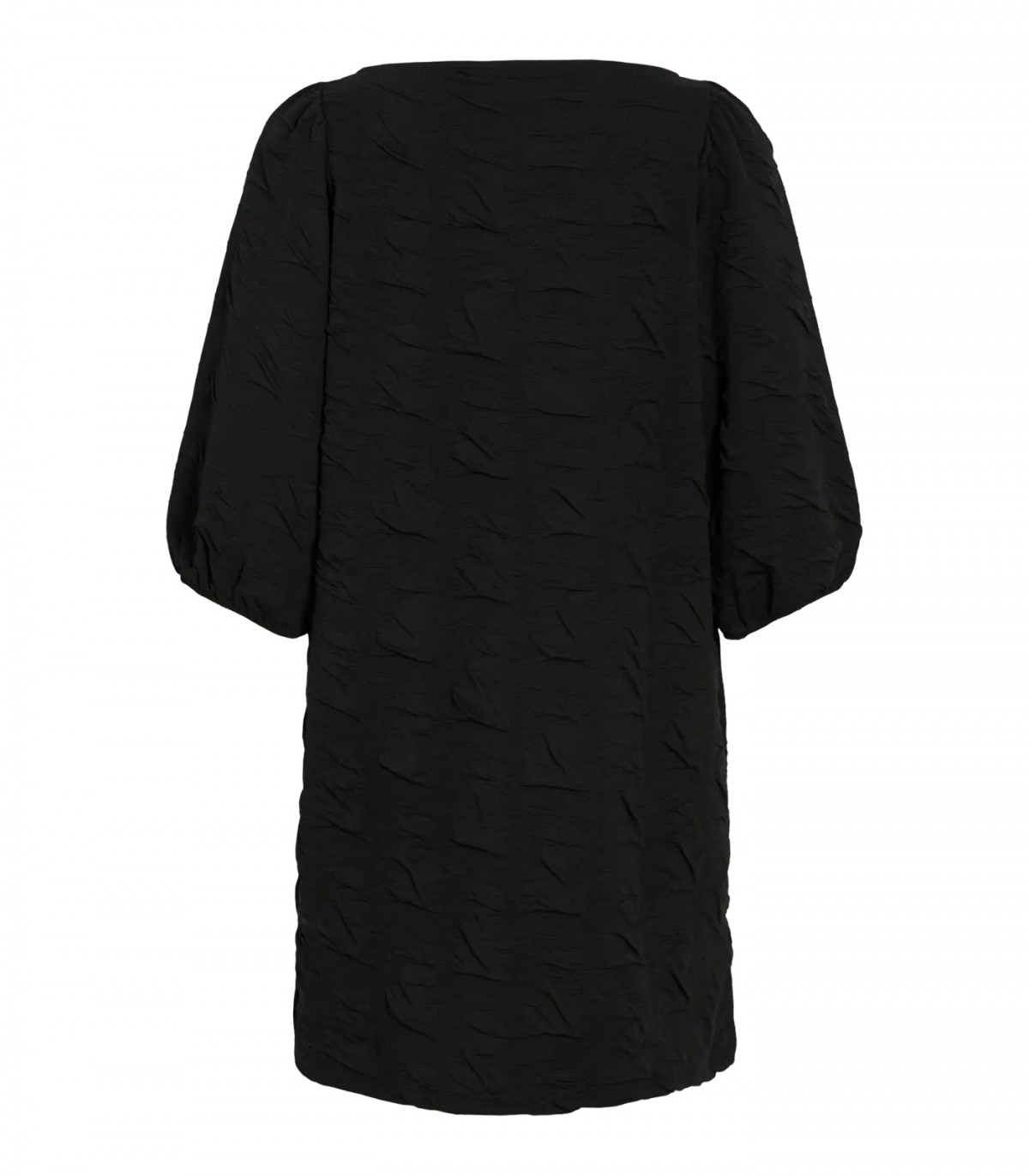 Vapaasti laskeutuva Vila-naisten mekko sopii sekä arkeen että juhlavampiin tilaisuuksiin. Teksturoitu kangas antaa syvyyttä mustalle sävylle ja kolmeneljäsosan pituiset puhvihihat lisäävät siluetin pehmeyttä.