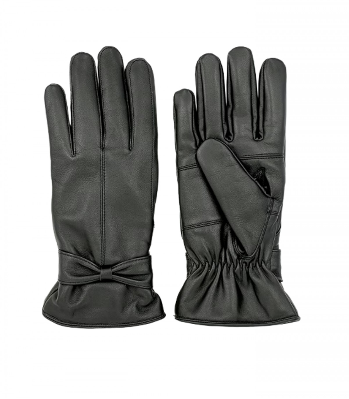 Tyylikkäästi muotoillut naisten nahkahanskat sopivat täydellisesti kylmempiin päiviin. Hanskat on valmistettu pehmeästä nahasta ja niissä on lämmin ja muhkea vuori. Ranteessa on kumipinta ja naisellinen nauhakoriste.