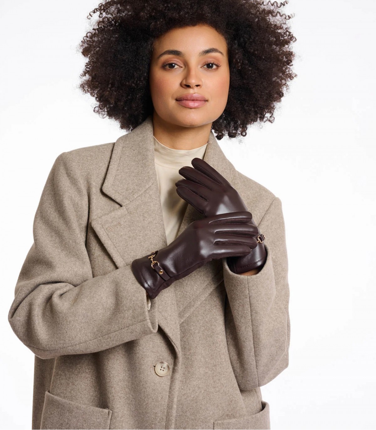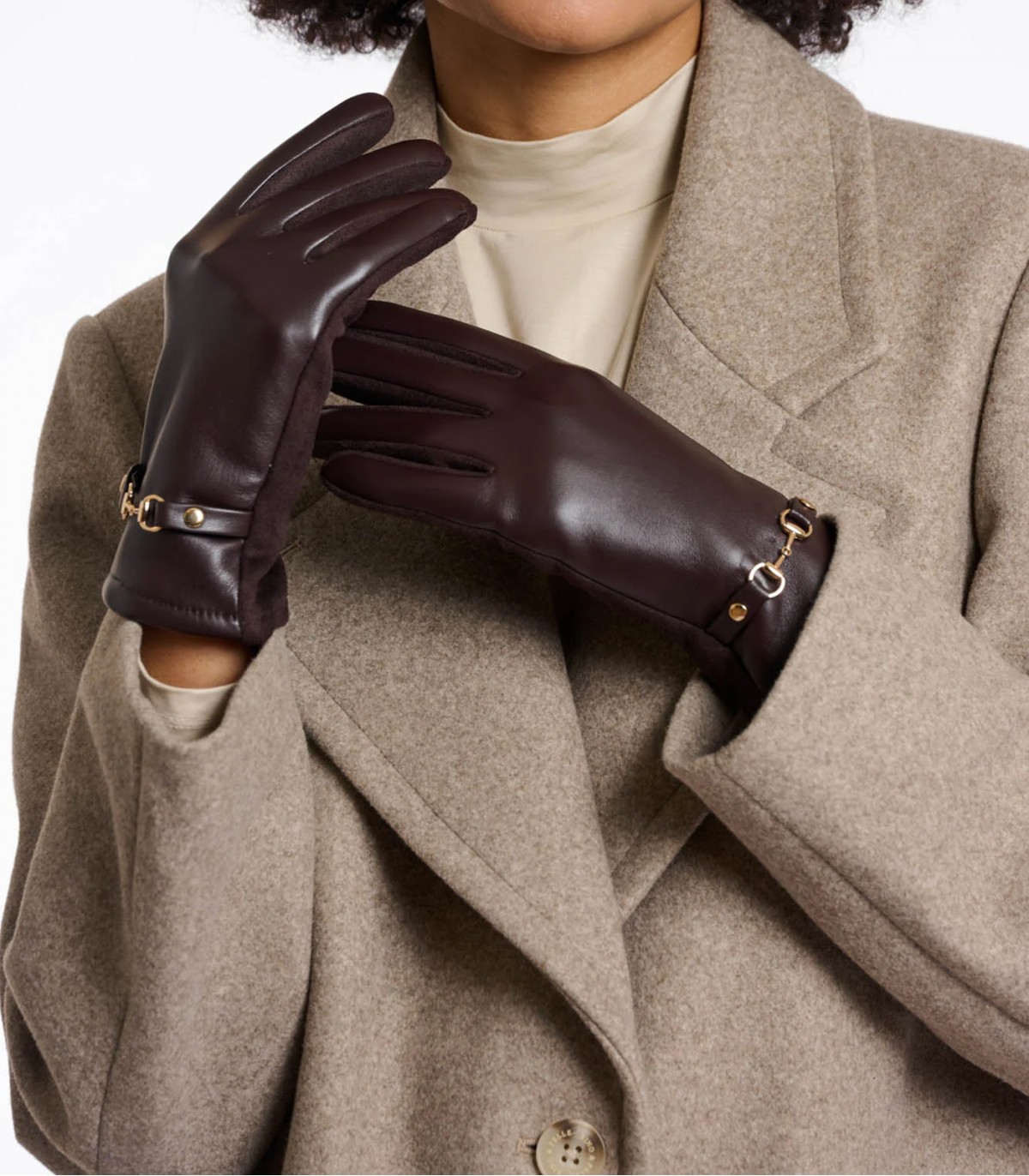 Tyylikkäästi muotoillut keinonahkaiset käsineet, joissa on sileä tekonahkapäällinen. Sisäpuoli on päällystetty pehmeällä mokkanahalla, joka pitää kätesi lämpiminä ja mukavina. Viimeistelty naisellisilla kullanvärisillä yksityiskohdilla.