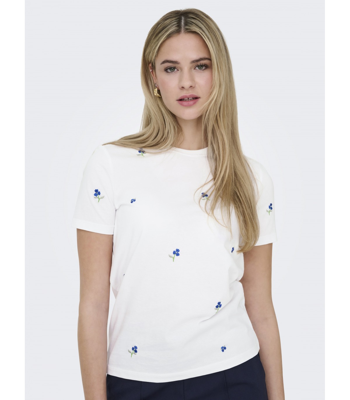 Lyhythihaisessa t-paidassa on edessä pieni kukkakuosi ja takana yksivärinen.