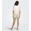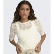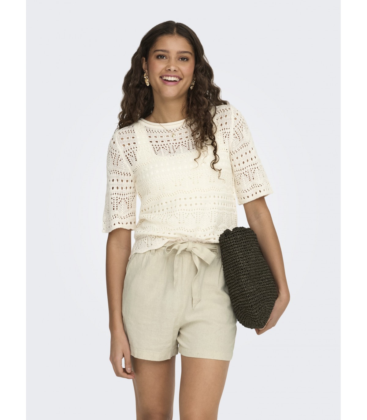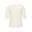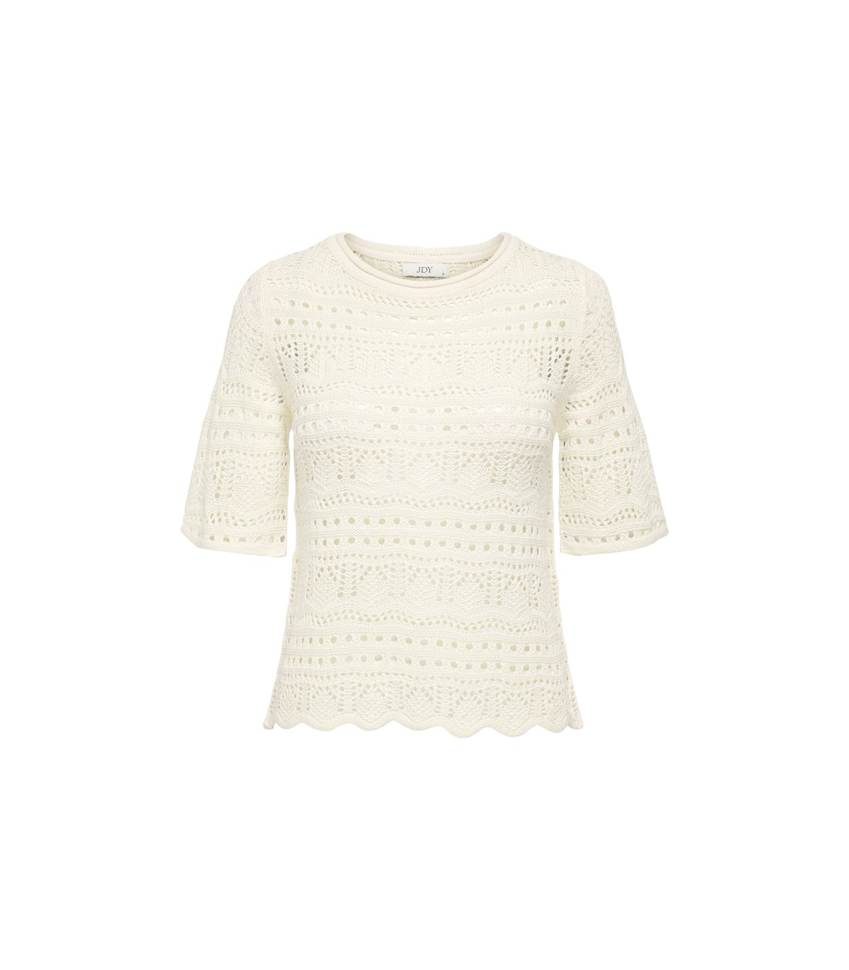 Tämä lyhyt ja ilmava neulepusero tuo ripauksen naisellisuutta mihin tahansa asuun. Pyöreä pääntie ja ¾-pituiset hihat luovat ajattoman ilmeen, ja laineikas viimeistely lisää leikkisyyttä. Täydellinen kesäpäiviin.