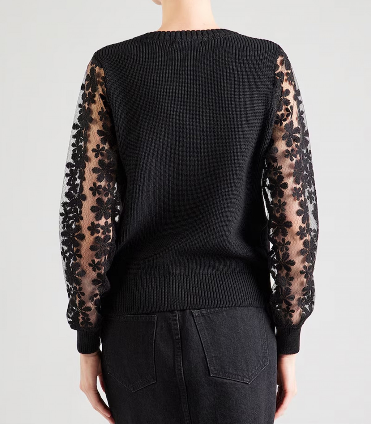 Hailys-naisten neulepusero, jossa on kontrastiväriset hihat. Neulottu vartalo-osa luo yksinkertaisen ja puhtaan ilmeen, ja pitsihihat lisäävät vaatteeseen visuaalista keveyttä ja koristeellista aksenttia.