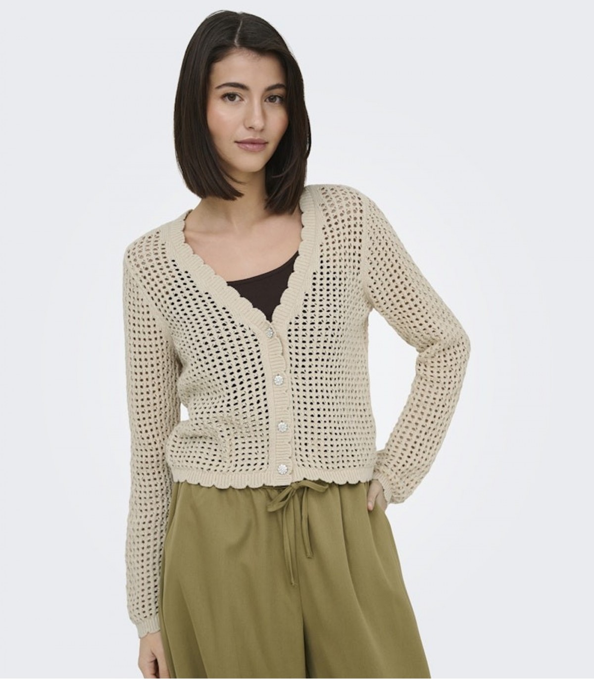 Tämä naisten neuletakki ilmavasta, strukturoidusta kankaasta sopii täydellisesti kerrospukeutumiseen kaikkina vuodenaikoina.