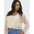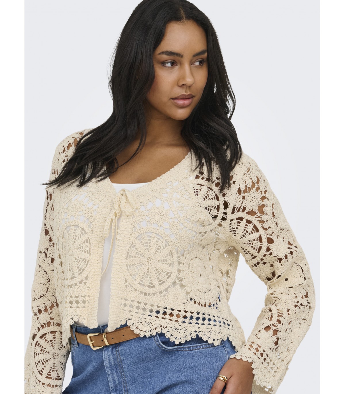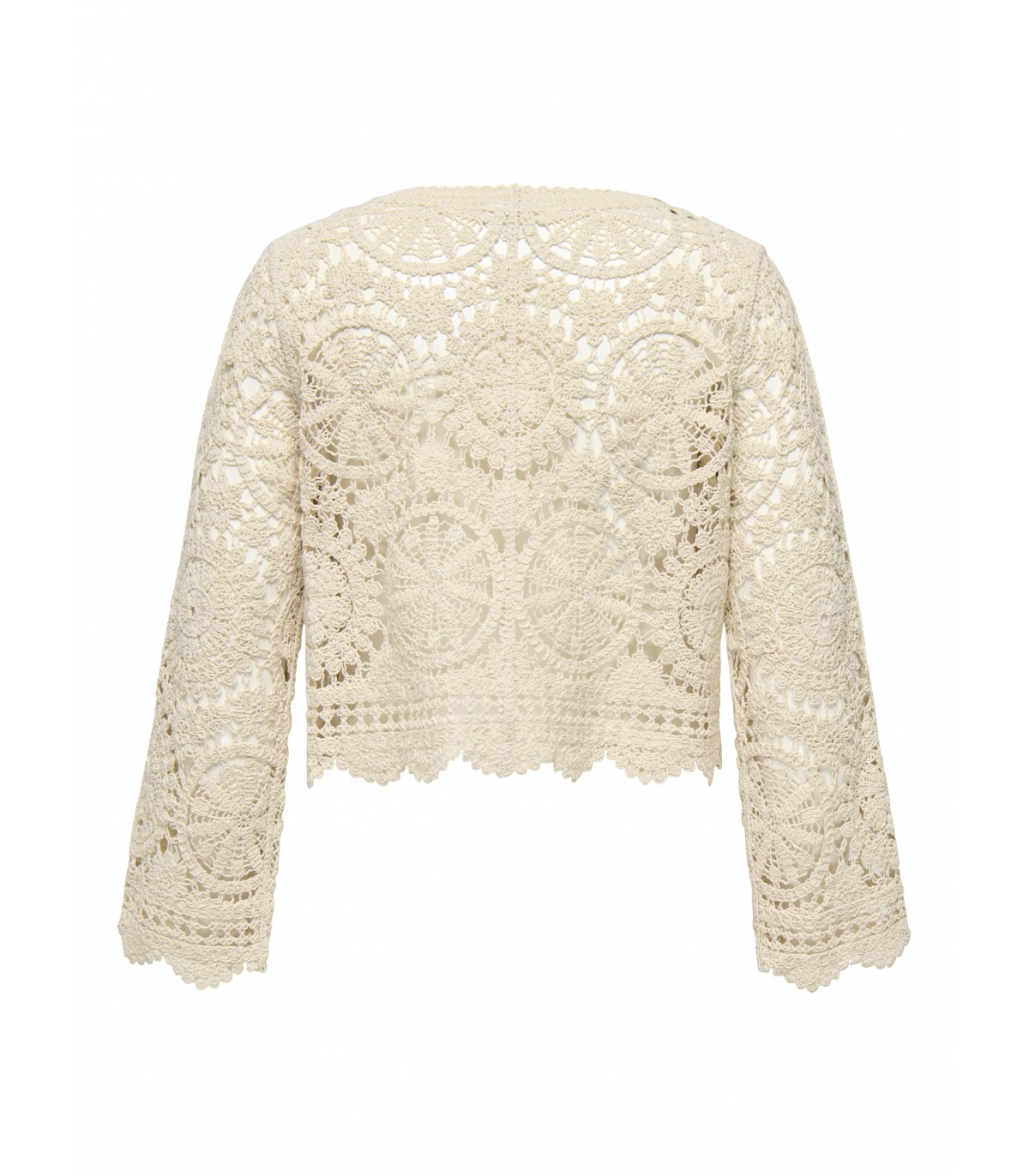Kevyt ja ilmava naisten neuletakki virkatulla kuviolla.