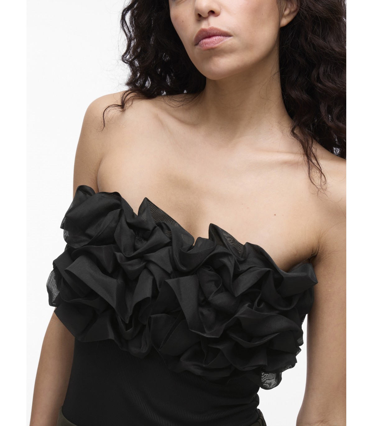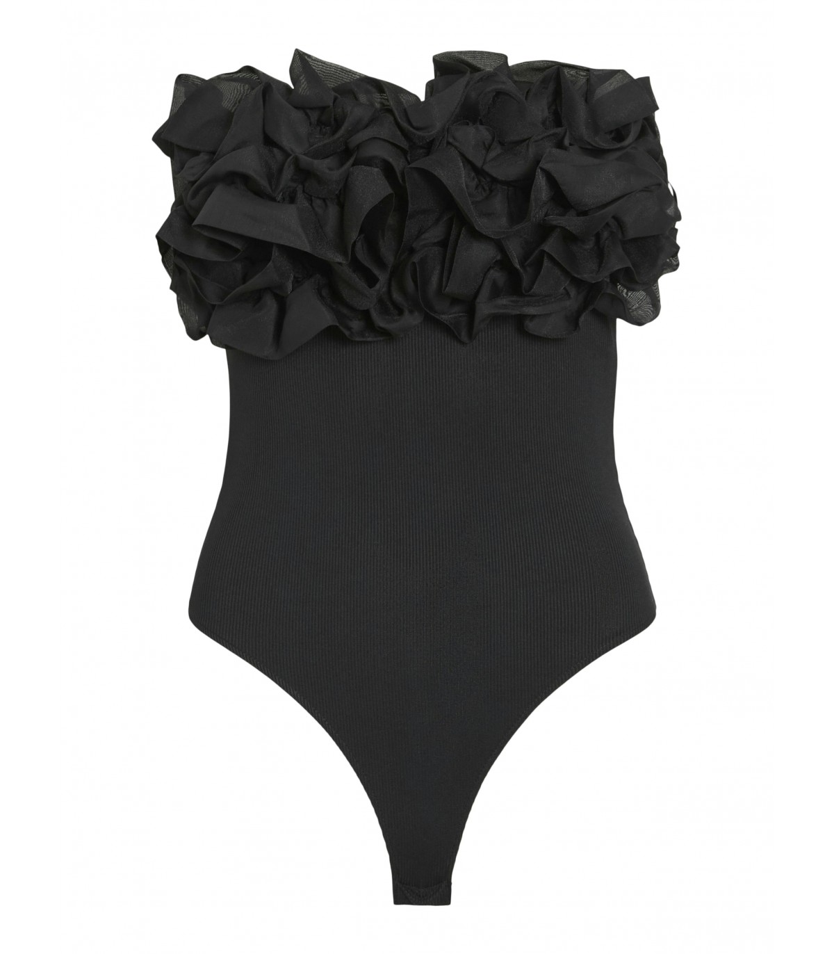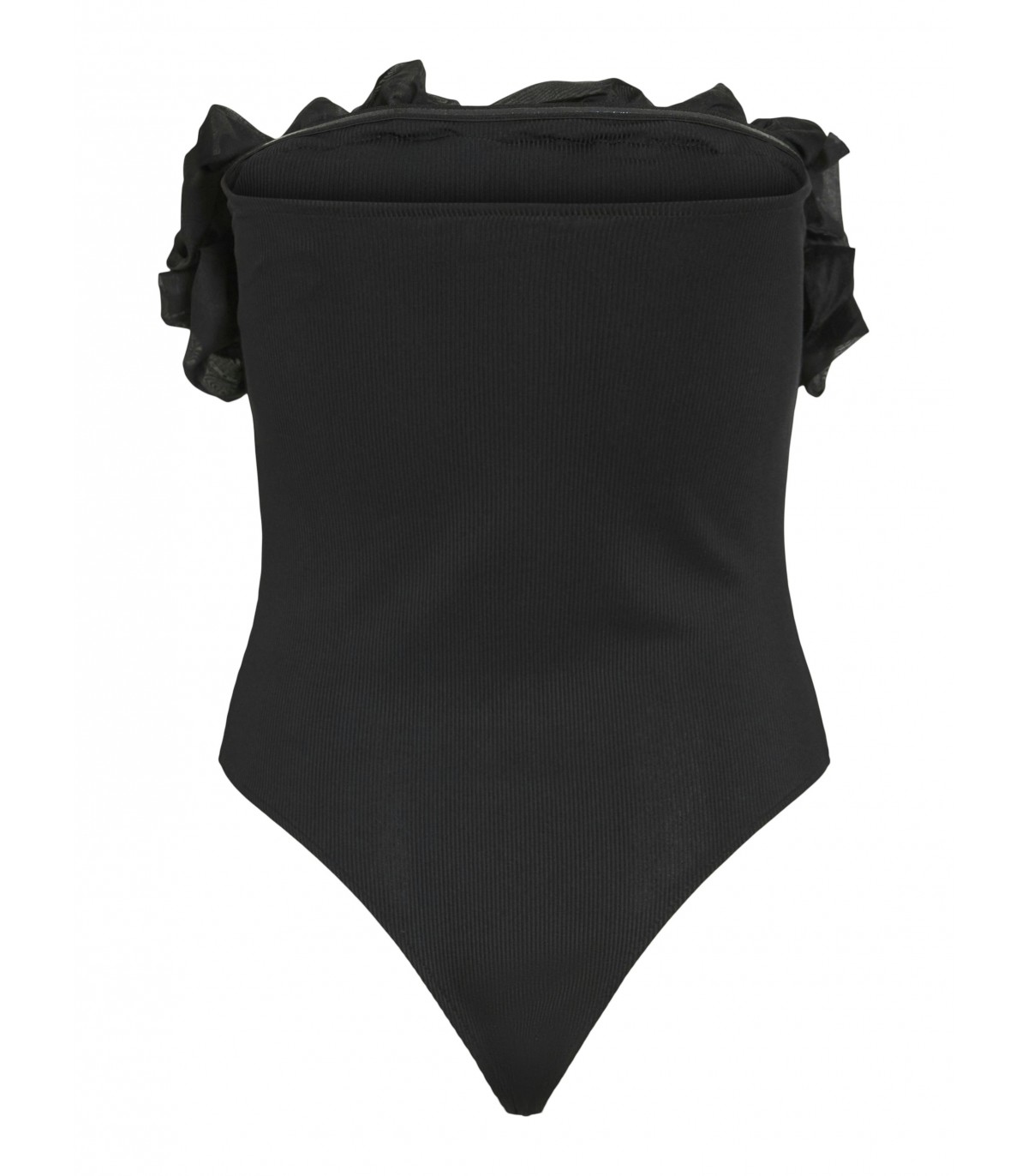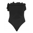 Näyttävä olkaimeton body, jossa on röyhelöitä ja istuva leikkaus. Täydellinen juhlavaan käyttöön hameen tai housujen kanssa.