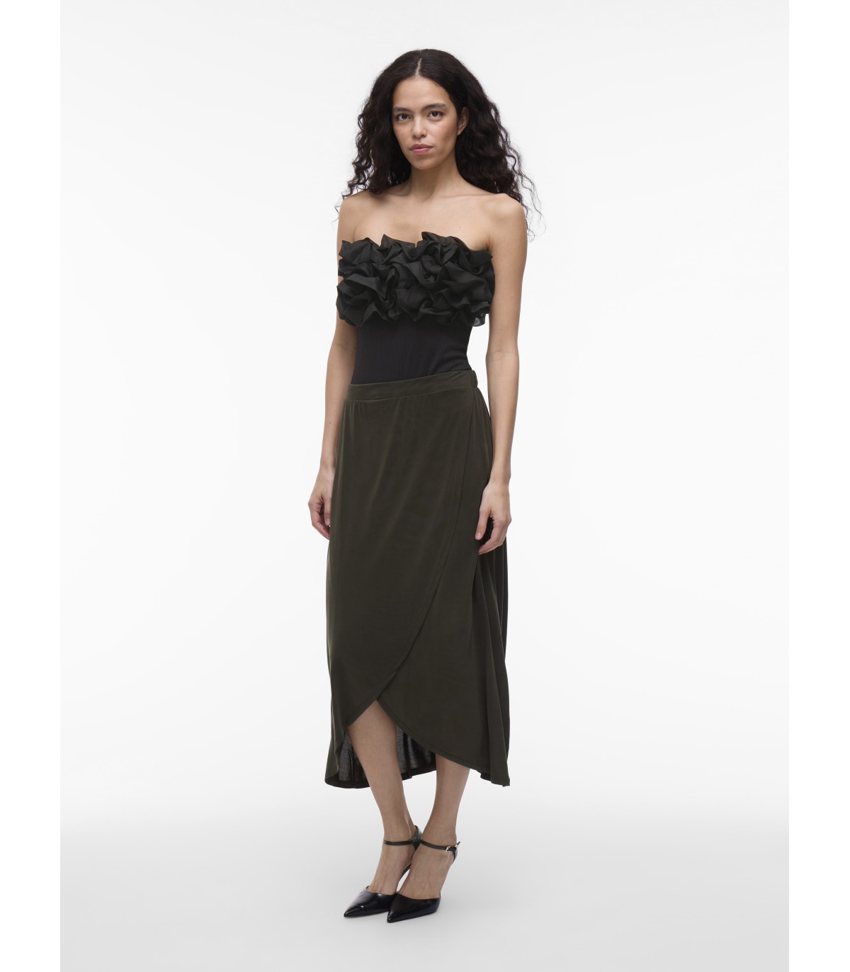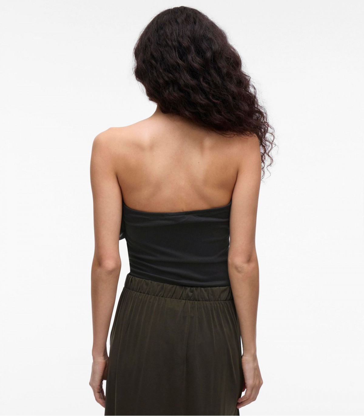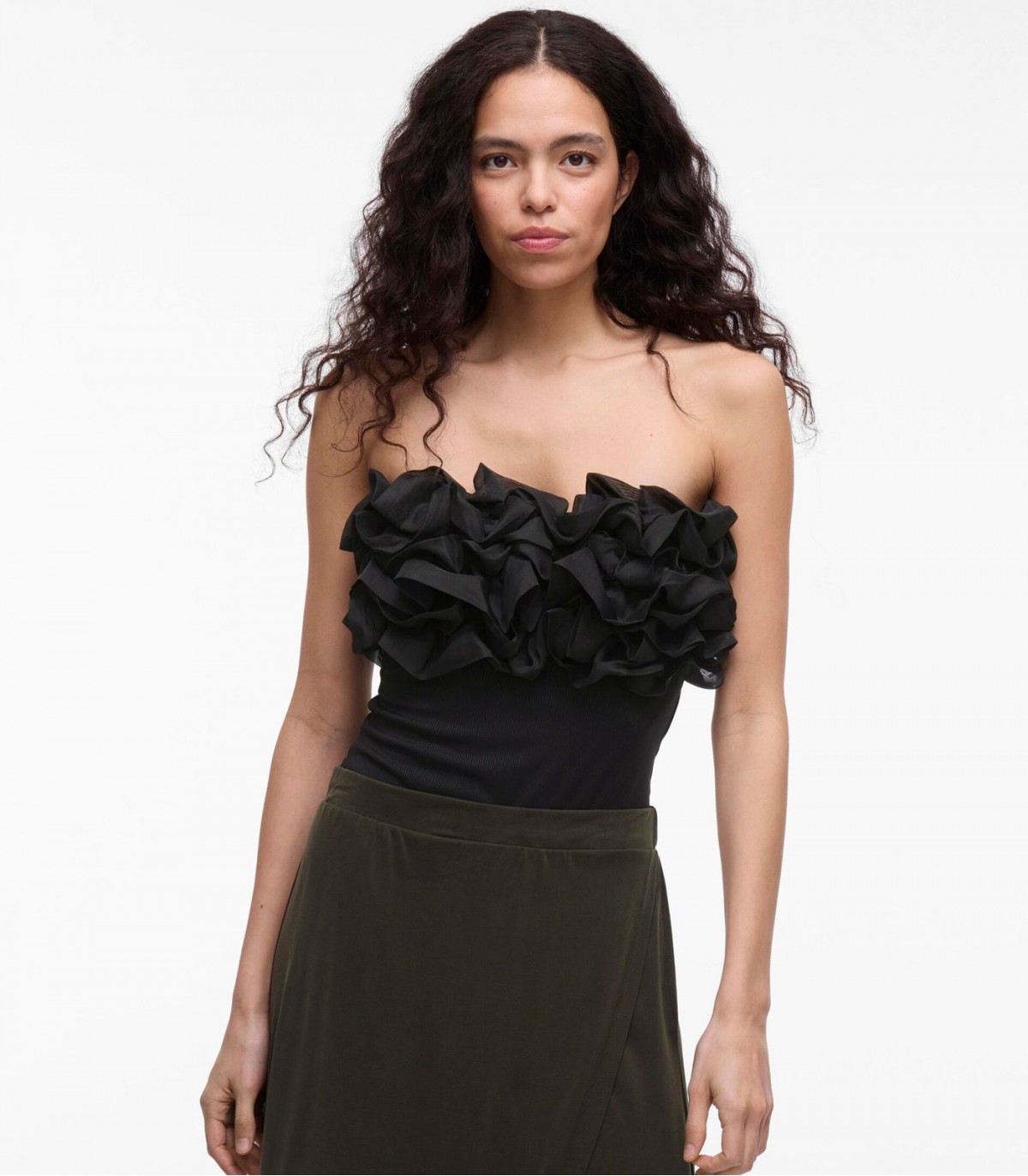 Näyttävä olkaimeton body, jossa on röyhelöitä ja istuva leikkaus. Täydellinen juhlavaan käyttöön hameen tai housujen kanssa.