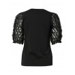 Kaunis lyhythihainen pusero, jonka röyhelöhihoissa on läpinäkyvää kangasta. Suora leikkaus ja pehmeä materiaali sopivat sekä arkeen että juhlavampiin tilaisuuksiin.