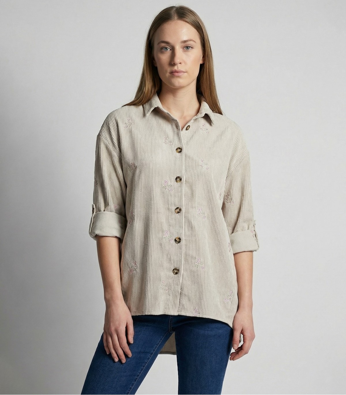 Hailys-naisten pidempi pusero, jossa on kirjailtu kukkakuvio. Puserossa on nappikiinnitys edessä ja käärittävät hihat. Mukava leikkaus sopii arkikäyttöön.