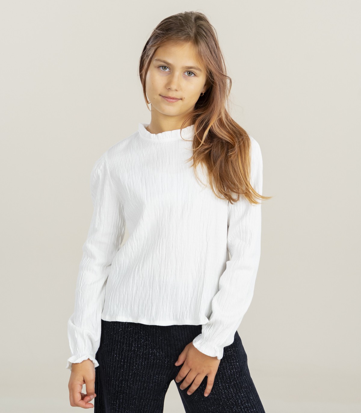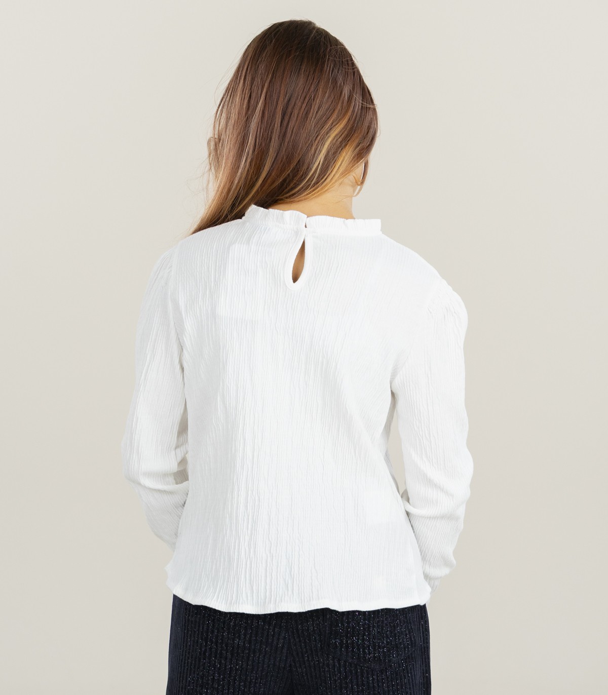Mayoralin pitkähihainen pusero ohuesta, hieman ryppyisestä puuvillakankaasta, joka laskeutuu ja istuu mukavasti. Selässä on pieni aukko, jossa on nappikiinnitys, joten se on helppo pukea.