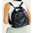 Monikäyttöinen keinonahkalaukku, jota voi käyttää reppuna tai olkalaukkuna. Laukussa on useita vetoketjullisia taskuja, säädettävät olkahihnat ja metallisia yksityiskohtia.