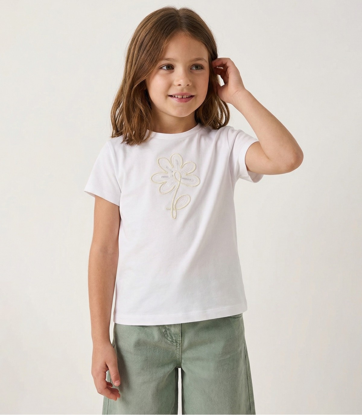 Mayoral T-paita on valmistettu puuvillan ja elastaanin sekoituksesta, mikä varmistaa mukavan istuvuuden ja liikkumisvapauden. T-paidan etuosan herkkä kukkakirjonta lisää söpöä ja leikkisää ilmettä, mikä tekee siitä täydellisen valinnan nuorten muodin ystävien päivittäiseen käyttöön.