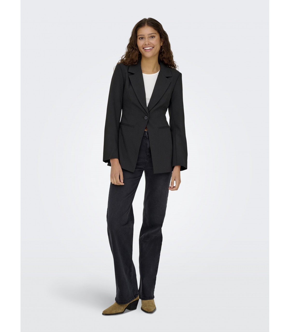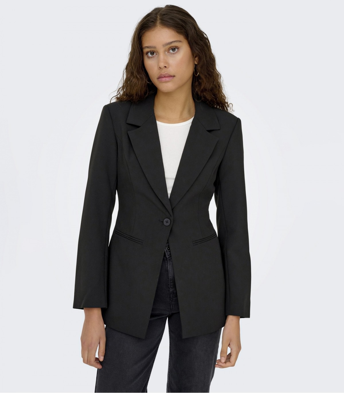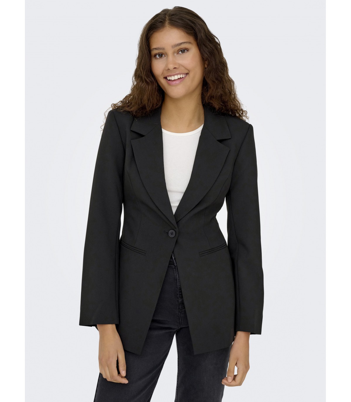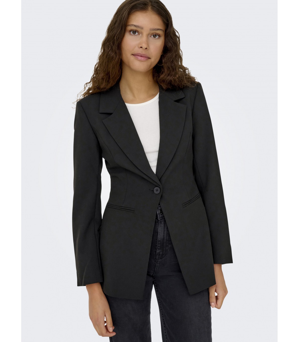 Naisellinen ja hyvin istuva takki, joka sopii sekä töihin että juhlatilaisuuksiin. Pidempi leikkaus ja vartaloon työstetyt leikkauslinjat luovat naisellisen siluetin.