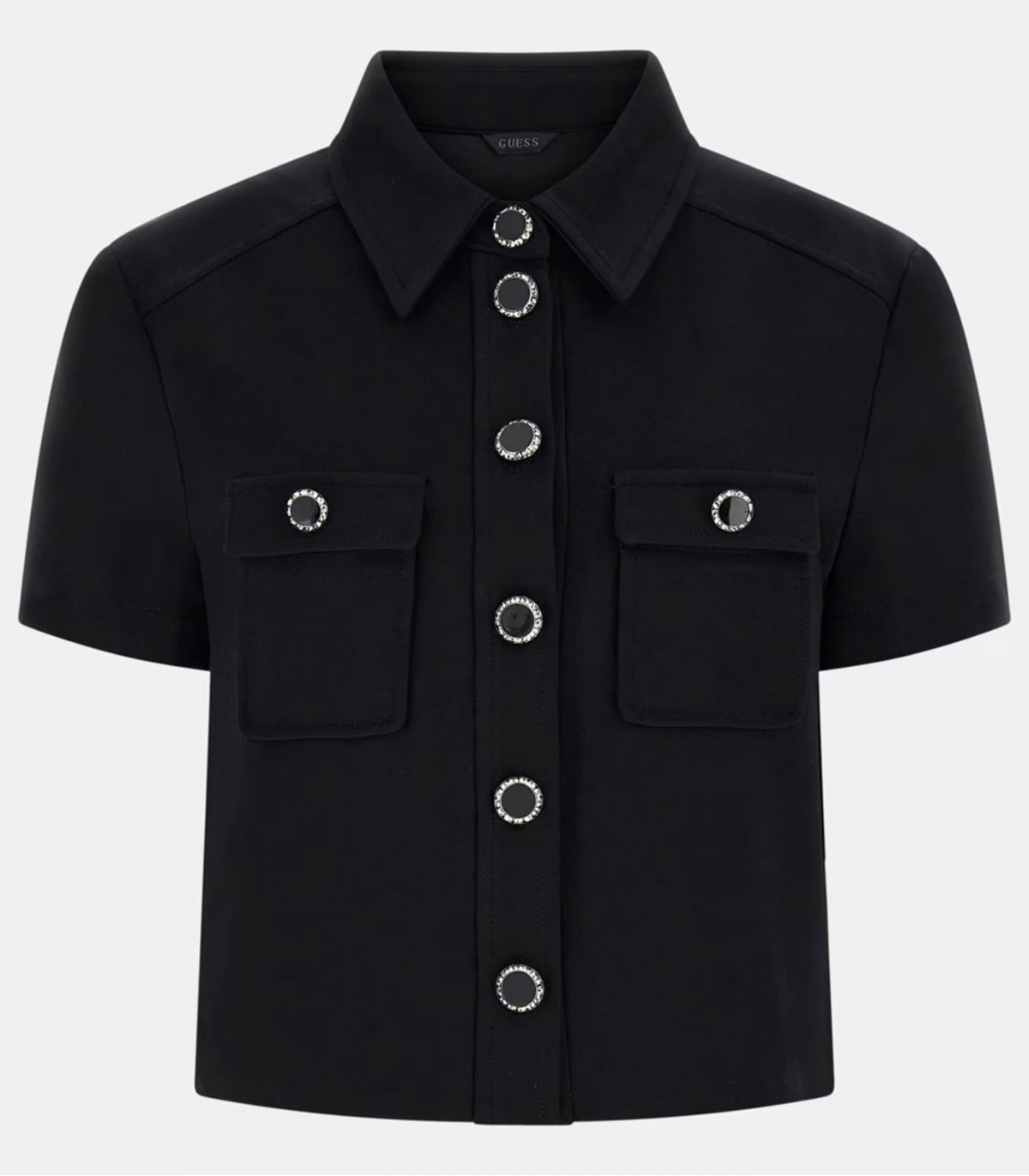 Lyhyt viskoosisekoittepusero, jossa on klassinen paitamainen leikkaus ja modernit lyhyet hihat. Koristeltu tyylikkäillä napeilla ja tehokkaalla kehyksellä. Täydellinen yhdistettäväksi hameen tai korkeavyötäröisten housujen kanssa.