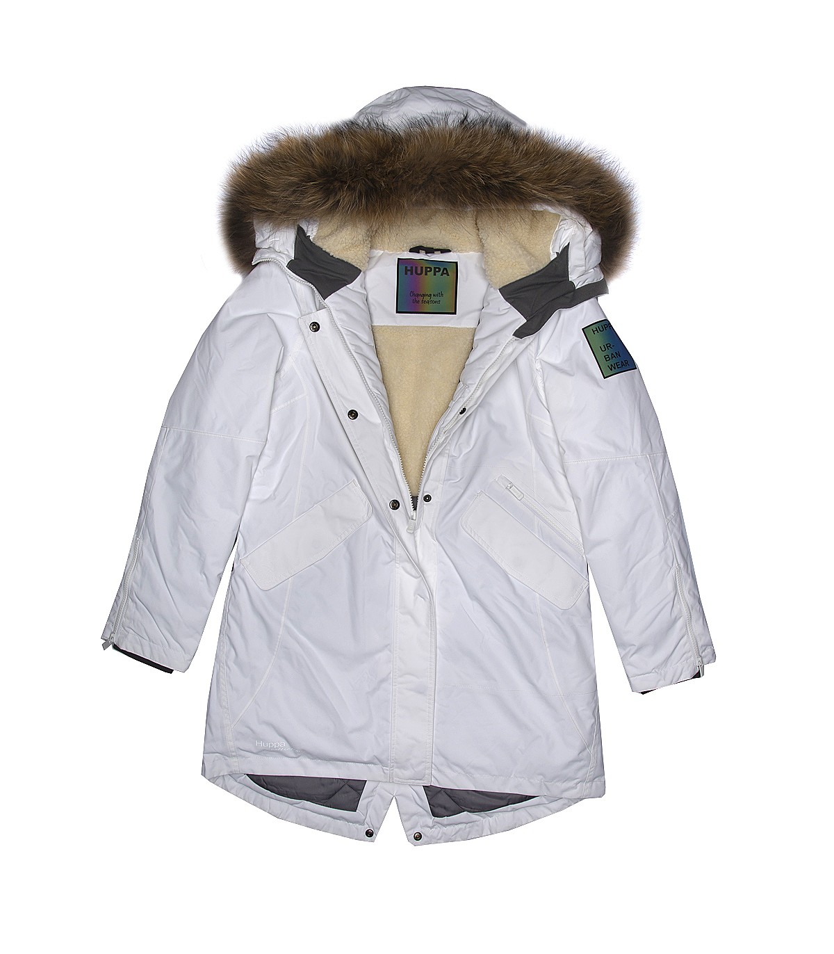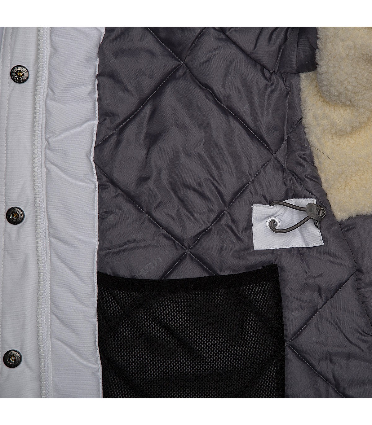- Keinotekoinen lampaannahkavuori yläselässä ja hupun sisäpuolella.
