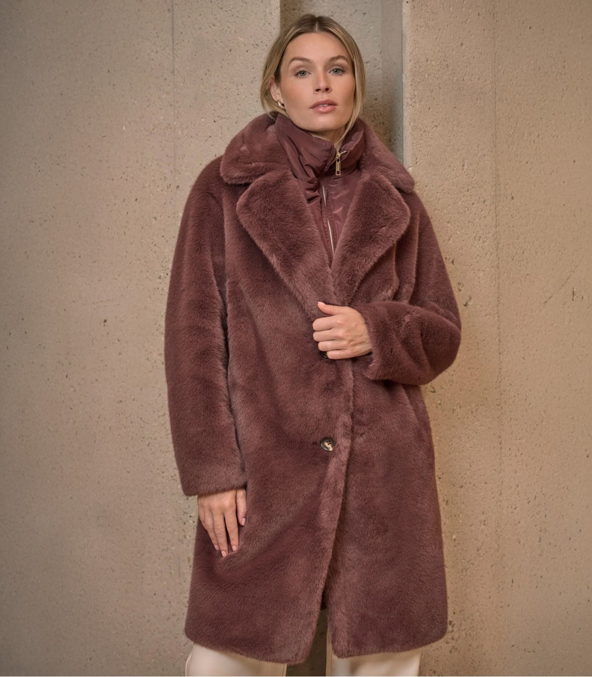 Tämä pehmeä tekoturkisnahkatakki on mukava ja lämmin viileinä päivinä. Takissa on klassinen kaulus, nappikiinnitys ja käytännölliset sivutaskut. Irrotettavan pehmustetun kauluksen ansiosta, joka voidaan kiinnittää tai irrottaa vetoketjulla, voit säätää takin ulkonäköä ja lämpöä sään mukaan.