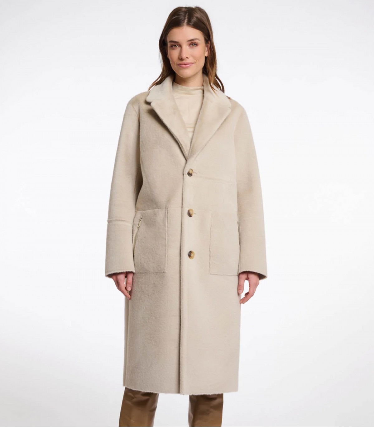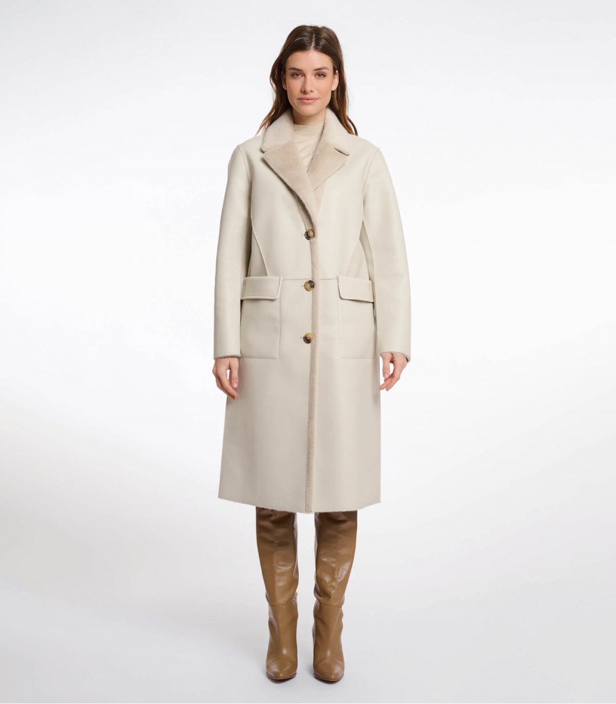 Käännettävä naisten takki, jota voi käyttää kummallakin tavalla haluamasi ilmeen mukaan. Takki on valmistettu toiselta puolelta tekonahasta ja toiselta puolelta ylellisestä tekoturkiksesta. Klassinen kaulus ja nappikiinnitys luovat ajattoman ilmeen.