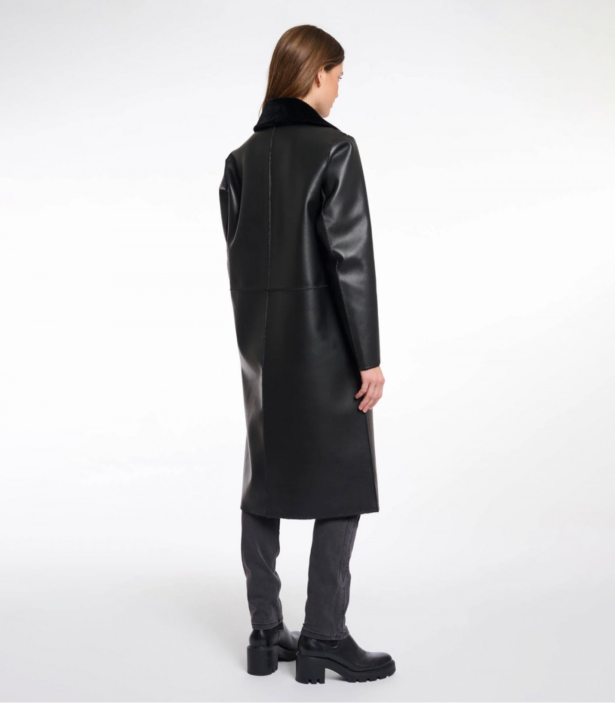 Käännettävä naisten takki, jota voi käyttää kummallakin tavalla haluamasi ilmeen mukaan. Takki on valmistettu toiselta puolelta tekonahasta ja toiselta puolelta ylellisestä tekoturkiksesta. Klassinen kaulus ja nappikiinnitys luovat ajattoman ilmeen.