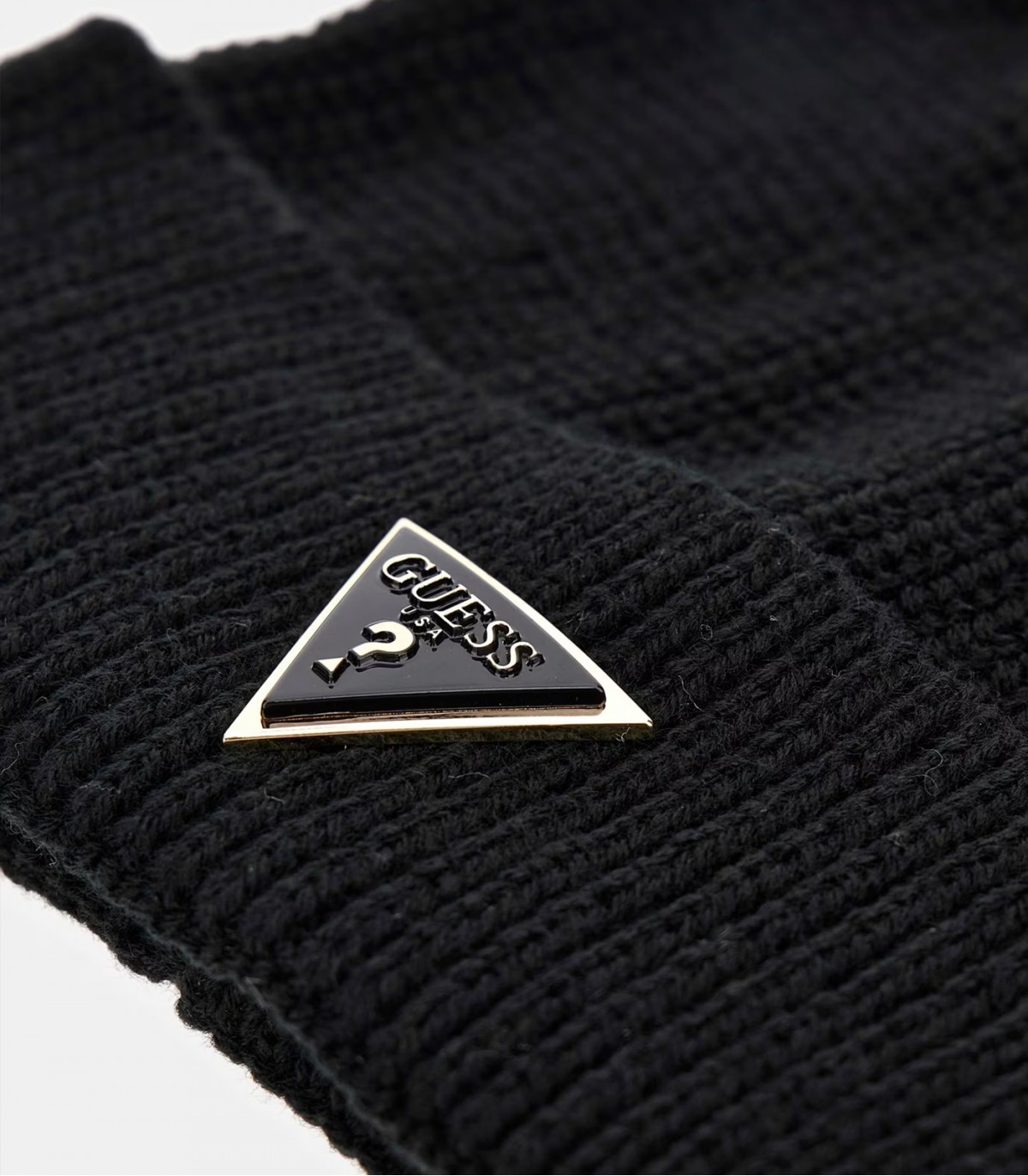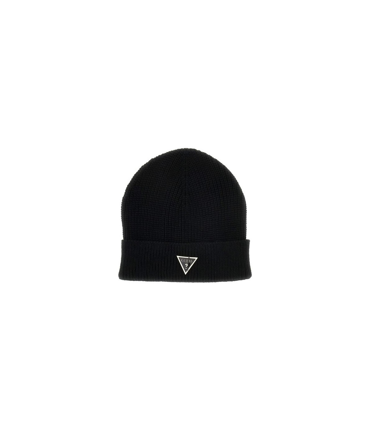 Guessin yksinkertainen ja käytännöllinen miesten neulottu pipo sopii viileämpiin päiviin. Ylösrullattu lieri istuu mukavasti. Edessä on merkin kolmionmuotoinen logo.
