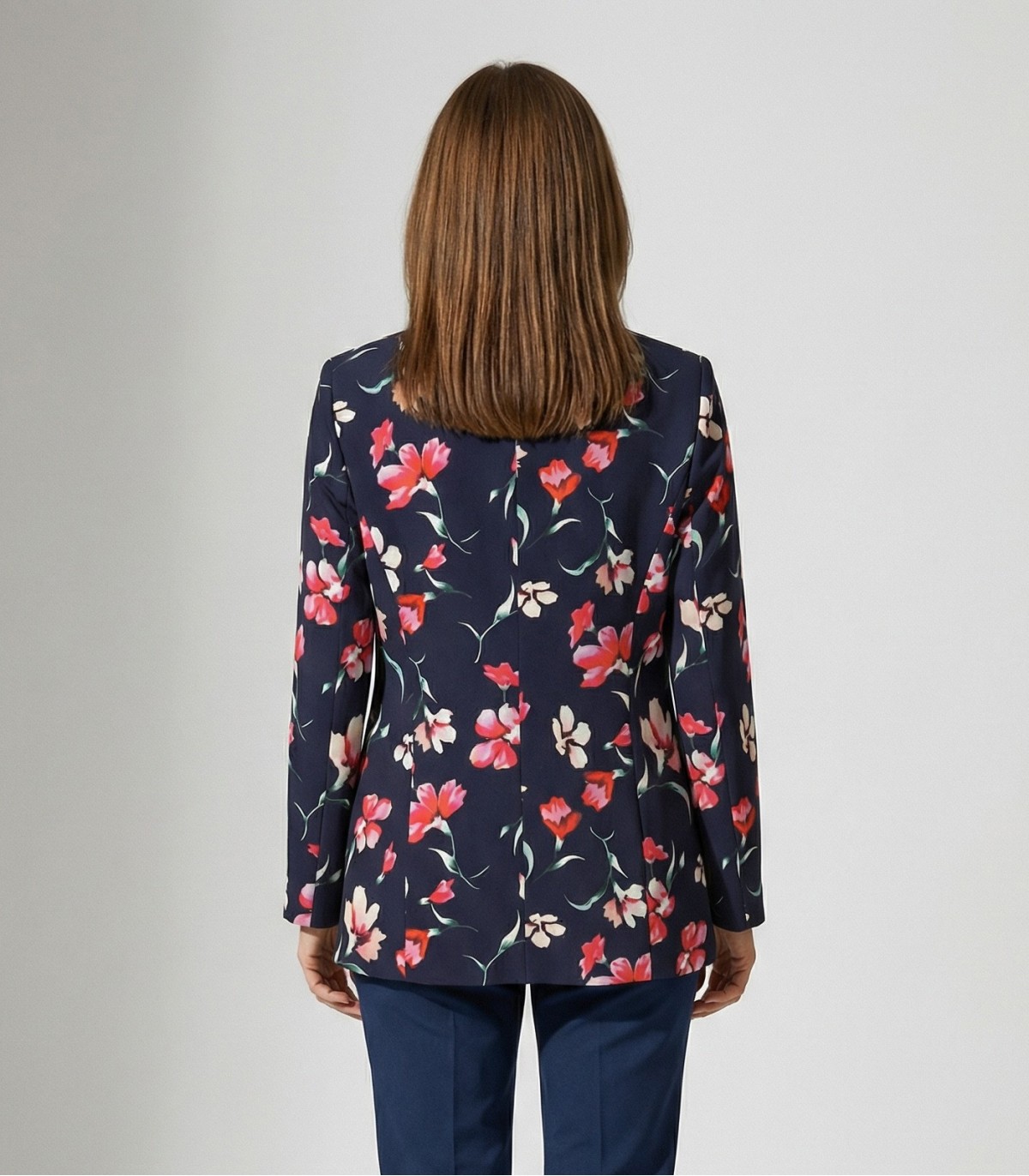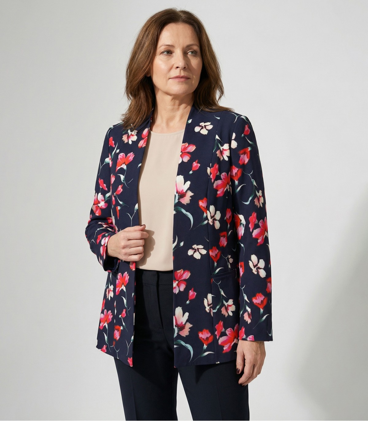 Elegantne lillemustriga Hansmark naiste jakk libedast materjalist. Jakil on ees keskel magnetkinnitus, mis loob puhta joone. Sobib suurepäraselt nii kleidi kui ka pükstega kandmiseks.
