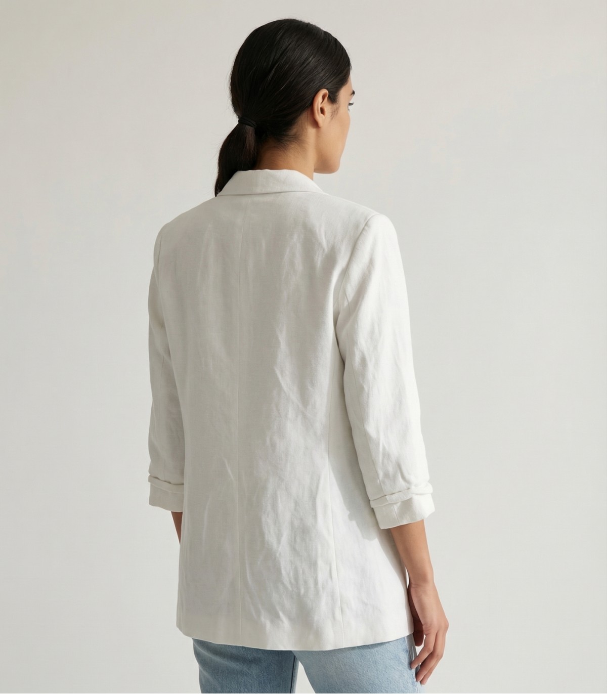 Pintsakul on avatud esiosa ja lai krae, mis loob puhta ning minimalistliku välimuse. Vastupidavast kangas hoiab hästi vormi ja sobib kandmiseks erinevatel hooaegadel.
