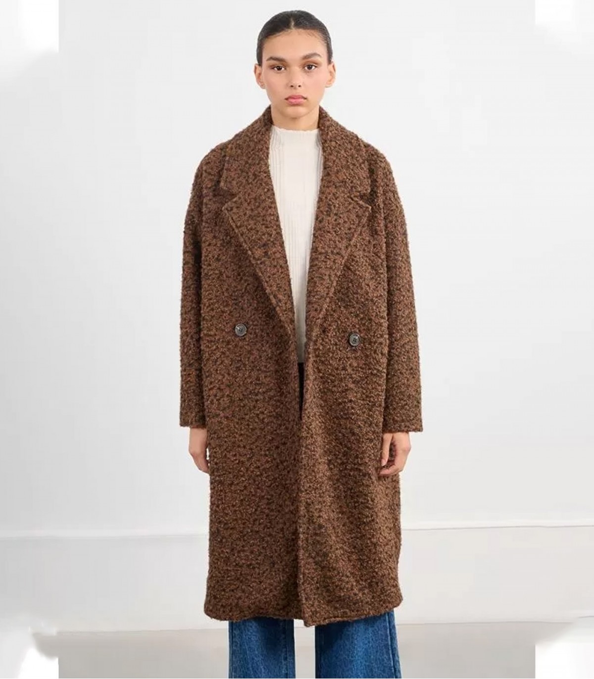 Mugav, klassikalise joonega pikk mantel. Sirge lõige ja kaherealine nööbirida annavad sellele ajatult viimistletud välimuse.