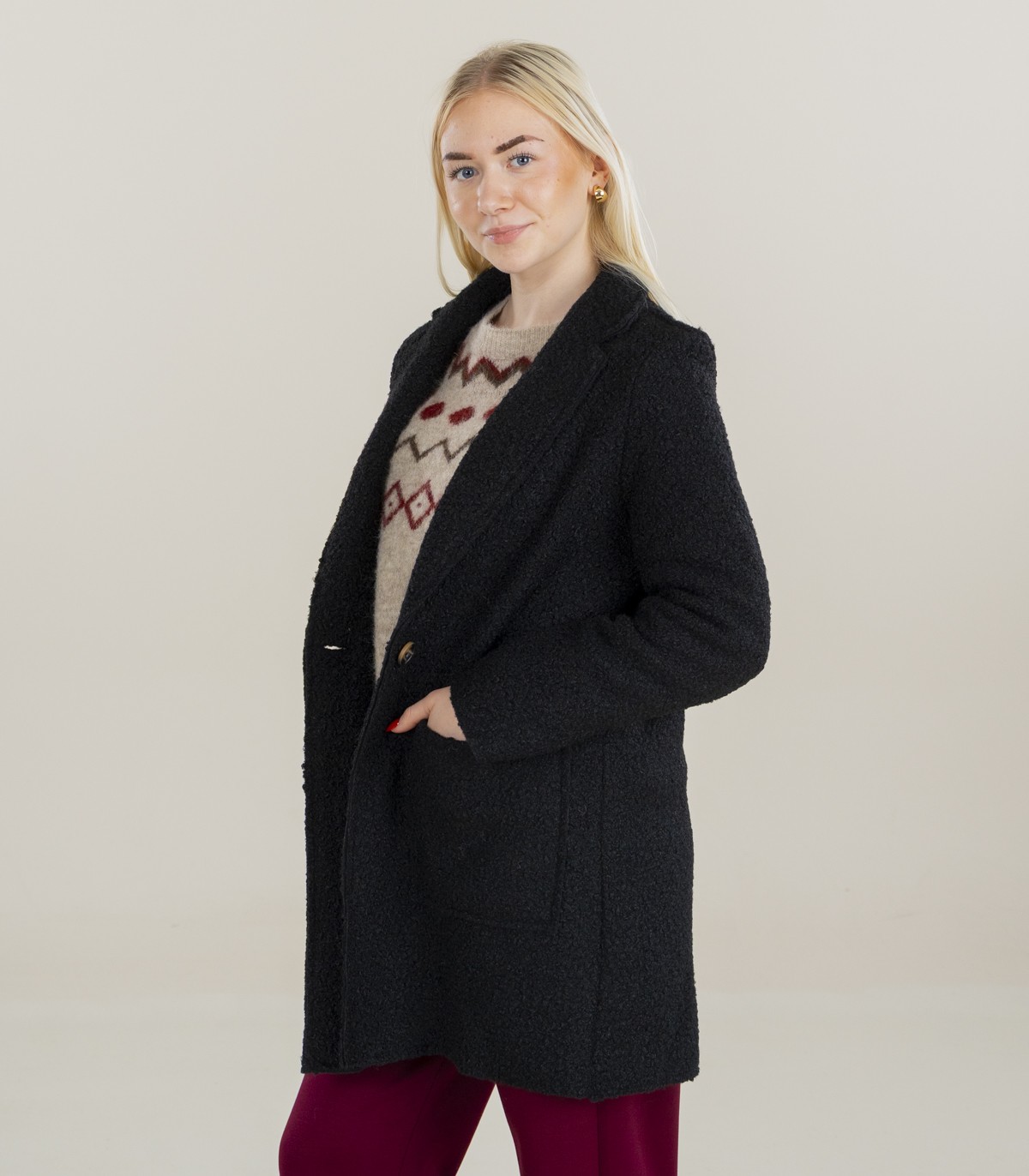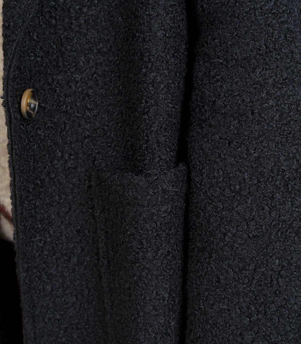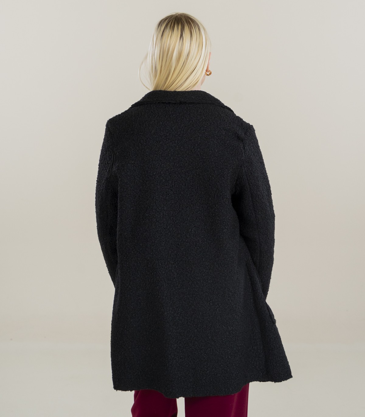 Klassikaline must mantel pehmest bukleekangast. Mantlil on sirge lõige, ühe nööbiga kinnitus ning avarad esitaskud.