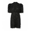 Elegantne lühike kleit erilise tekstuuri ja sädeleva efektiga. Lühikesed puhvis tegumoega varrukad ning kõrge kaelus loovad piduliku ilme. Kleidil on pihaosas lõige, mis rõhutab siluetti.