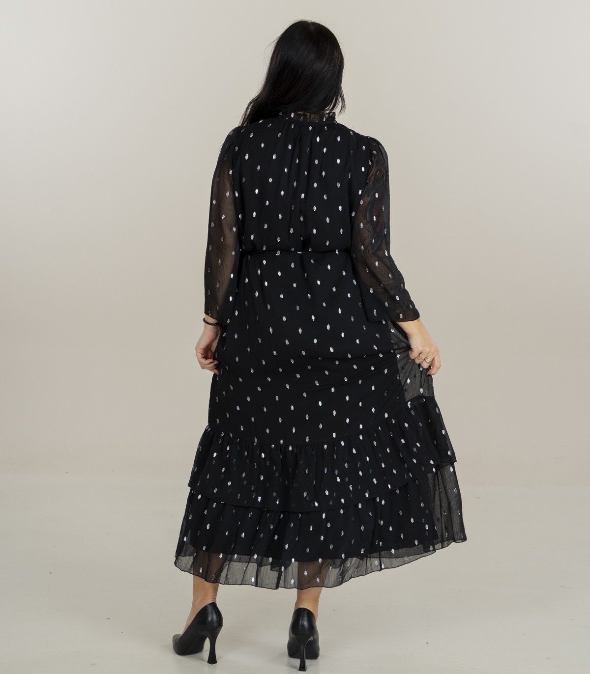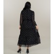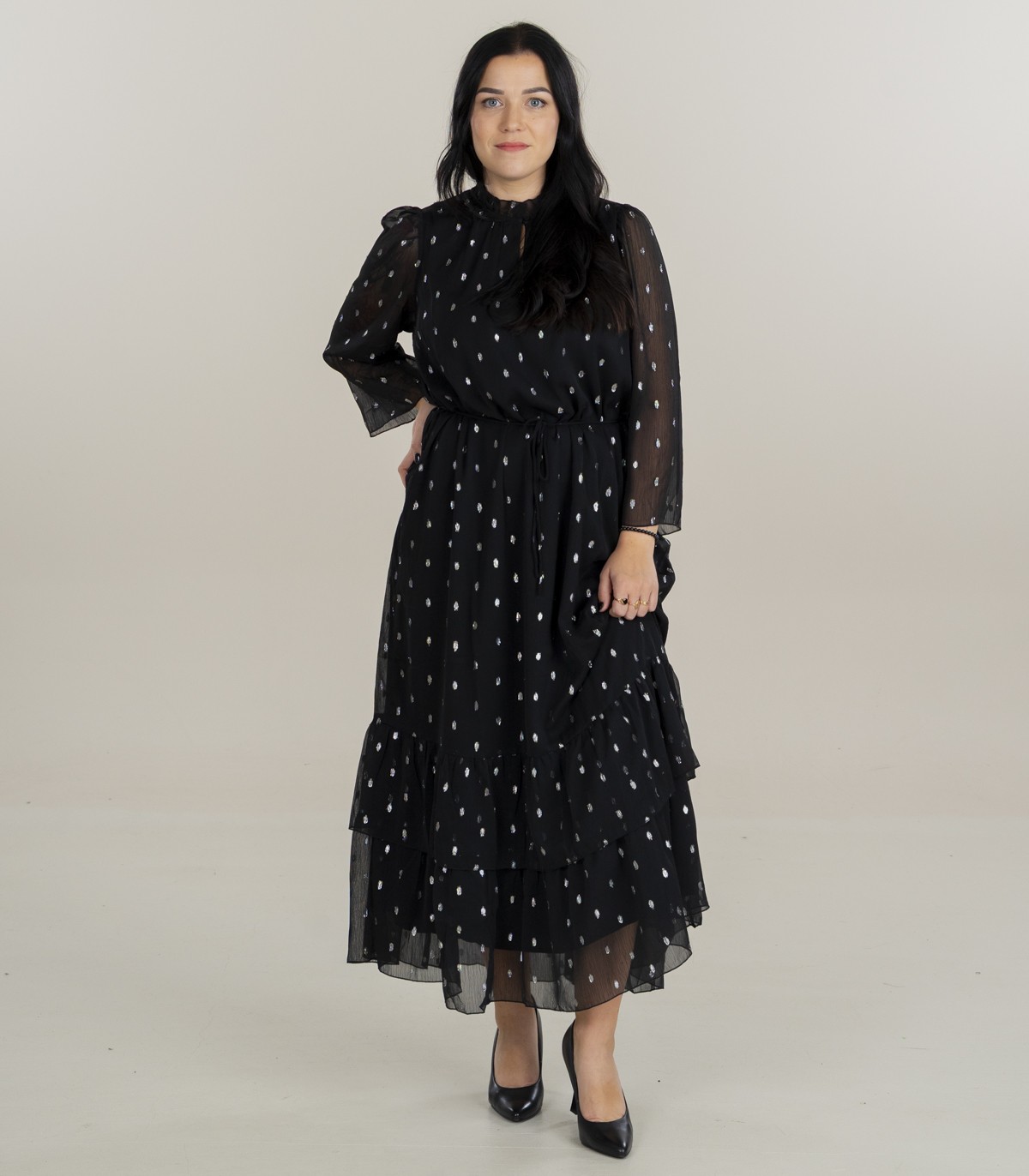 Õhuline musta värvi pikk kleit õrna täppmustriga. Läbikumavast kangast kleit on voodriga ning sobib hästi pidulikumaks kandmiseks.