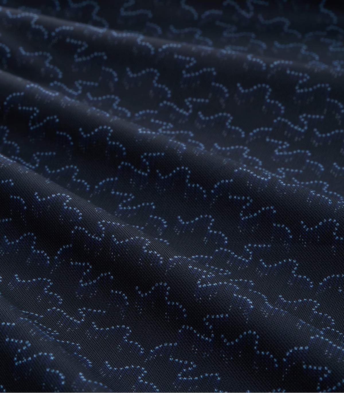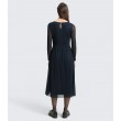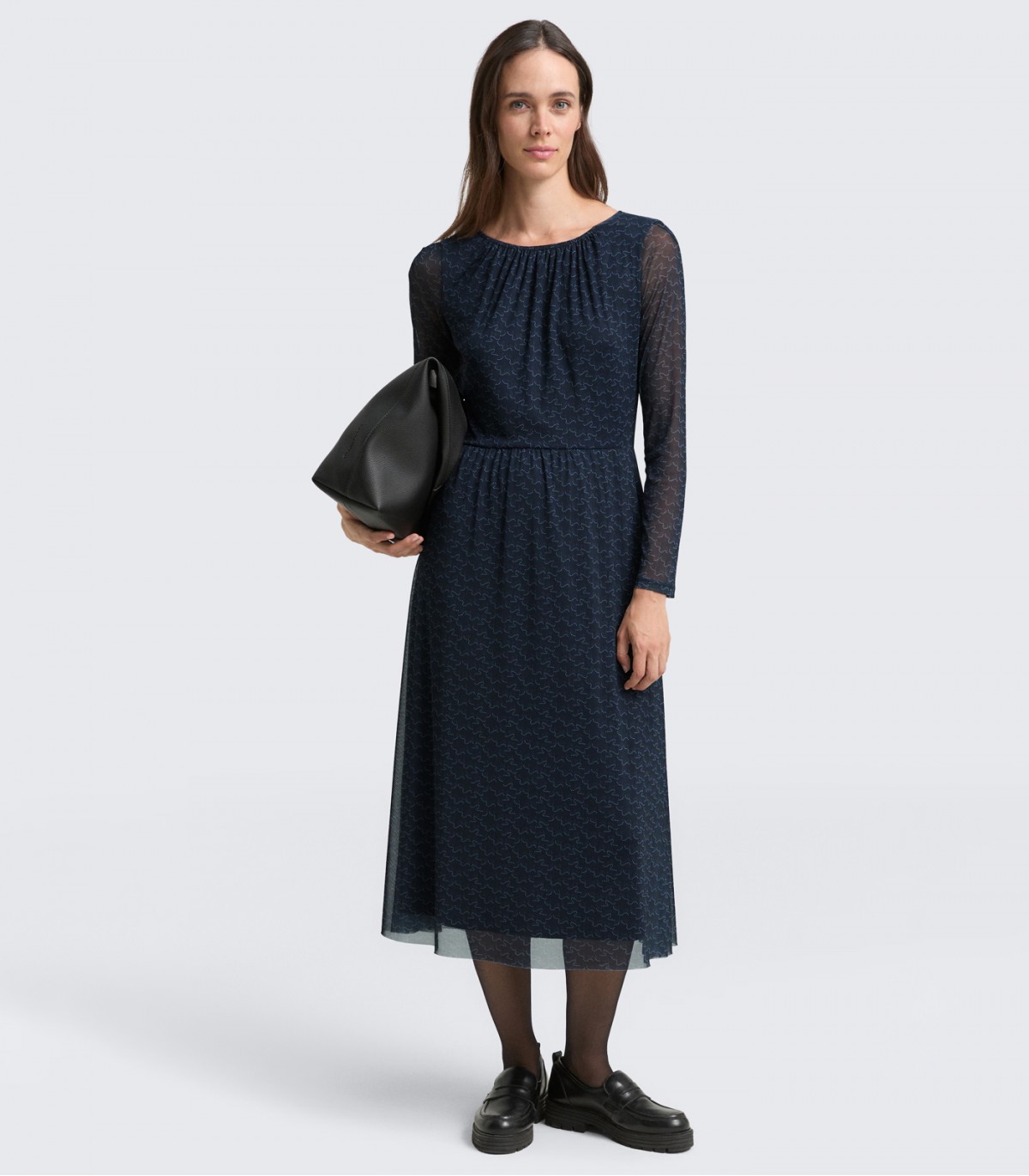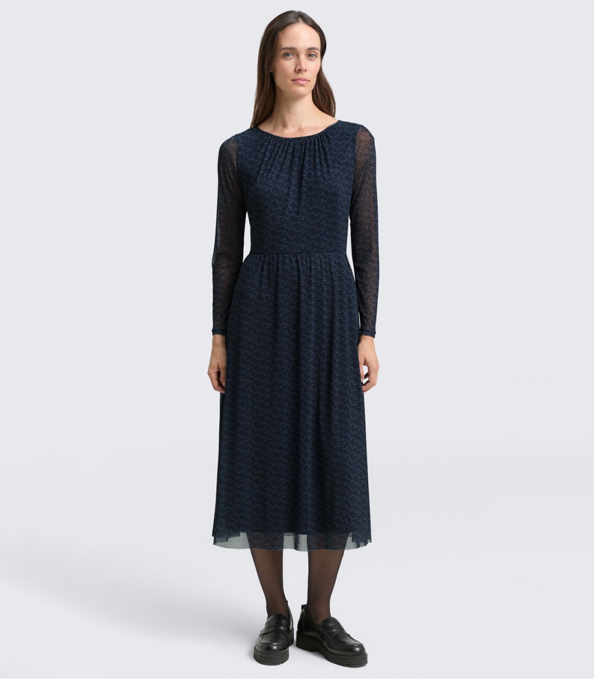 Voogavast ja kortsukindlast võrkkangast mustriline midipikkuses kleit. Mudelil on poolläbipaistvad pikad varrukad, väike nööpkinnitus seljal ning õrnad krooked vöökohas.