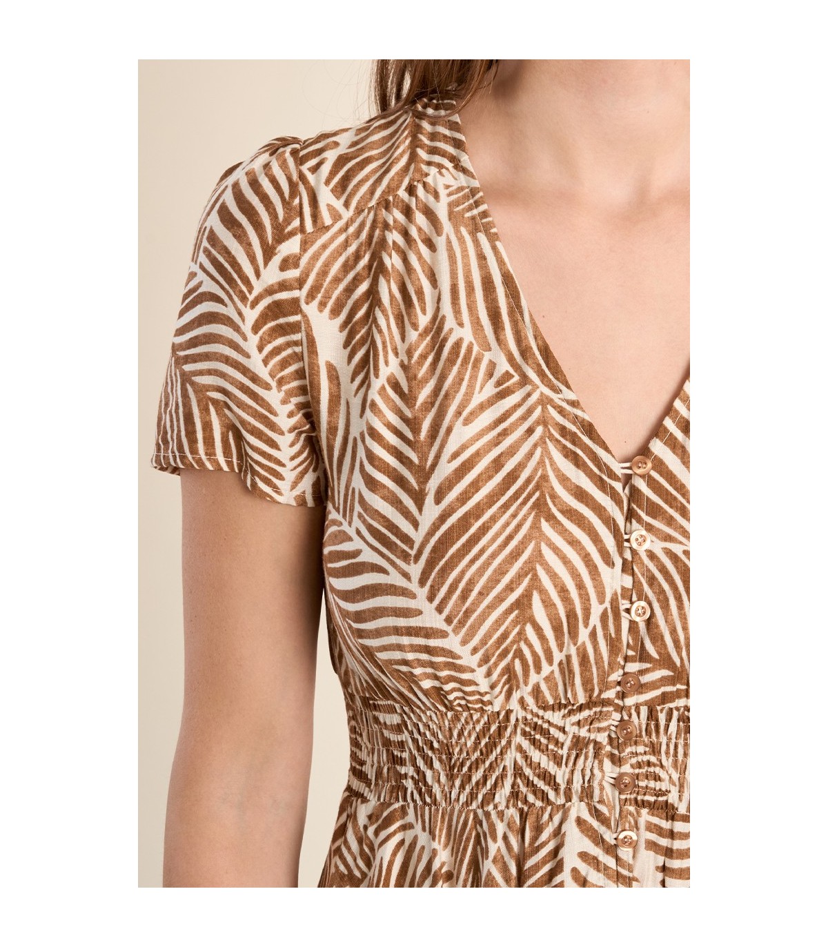 Pika ja lendleva lõikega Molly Bracken maxi-kleit silmapaistvast lehemustrilisest kangast. Elastne vöökoht ja voogav seelikuosa loovad mugava ning naiseliku silueti, mis sobib suviseks igapäevaseks kandmiseks ja ka puhkusehooajaks.
