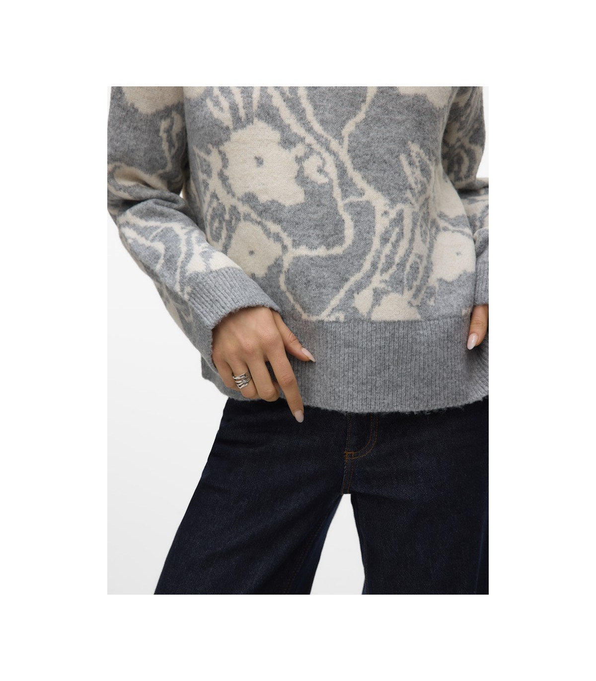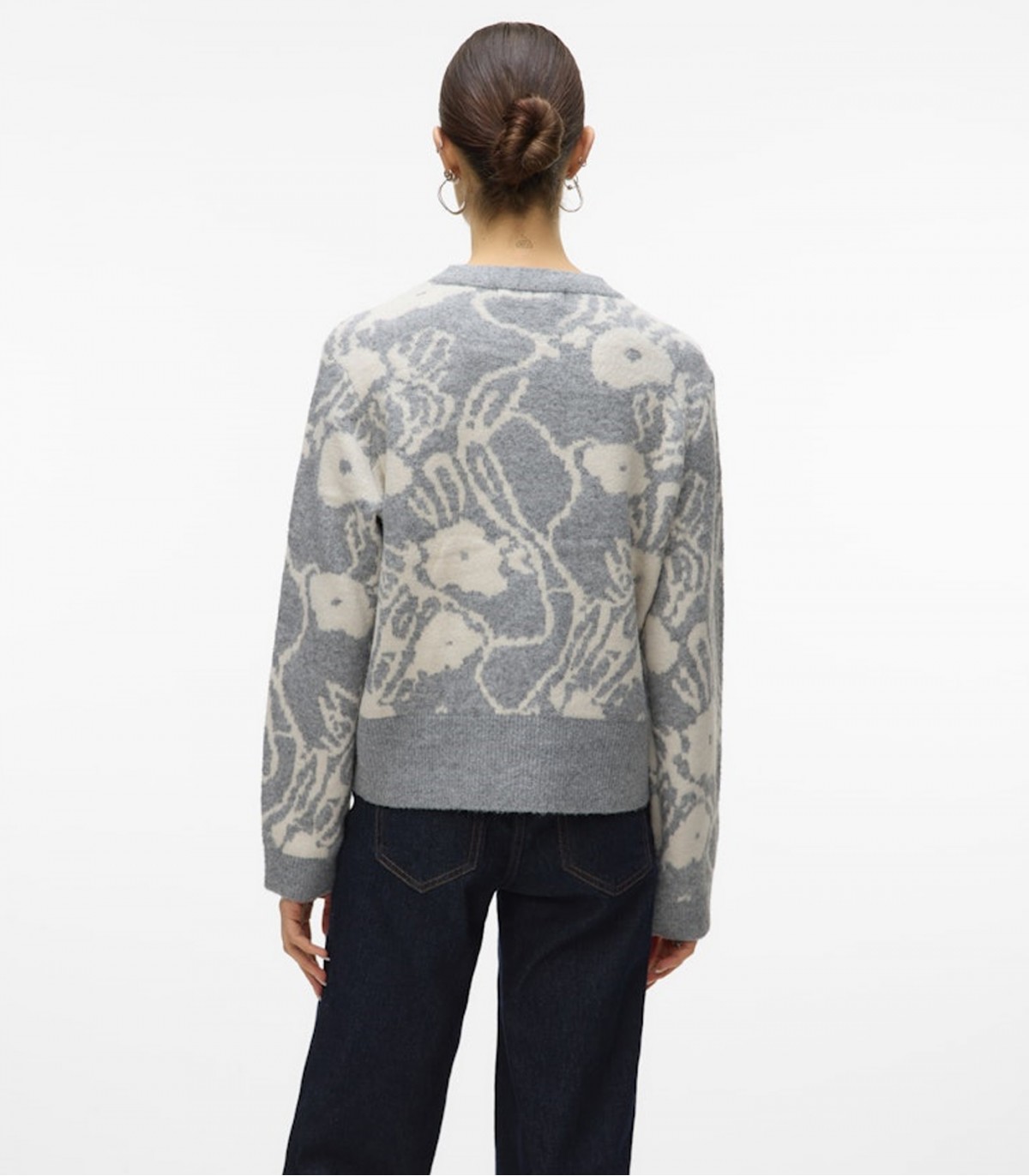 Pehme Vero Moda naiste kampsun, millel on helehallil taustal kontrastne heledate lillede muster. Klassikaline ümar kaelus ja soonikääred. Sobib kandmiseks nii teksade kui ka seelikuga.