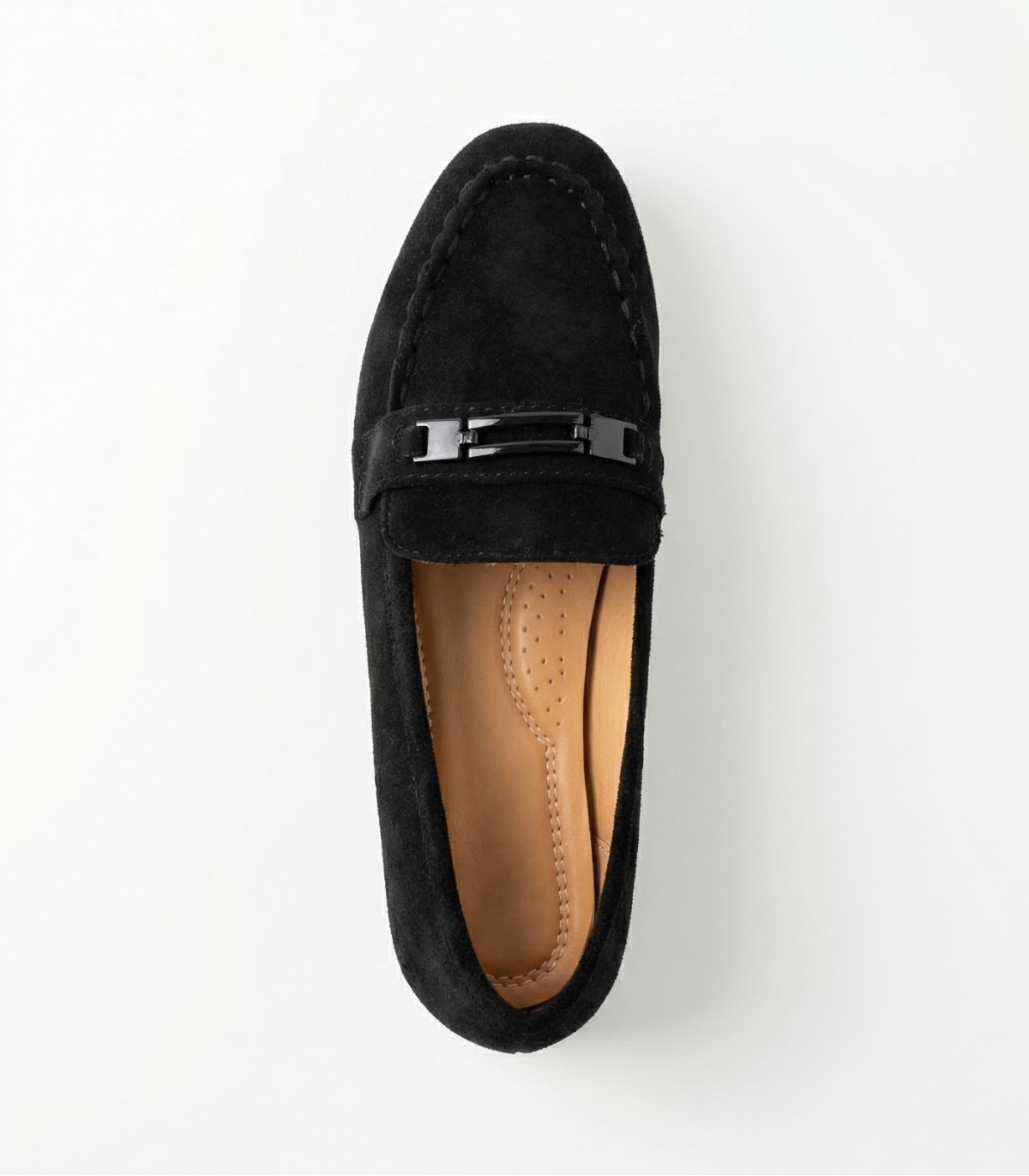 Elegantiški moteriški mokasinai su minkštu, šiek tiek aksominiu viršutiniu sluoksniu. Paprasta, santūri forma papildyta diskretiška metaline detale, suteikiančia rafinuotumo.