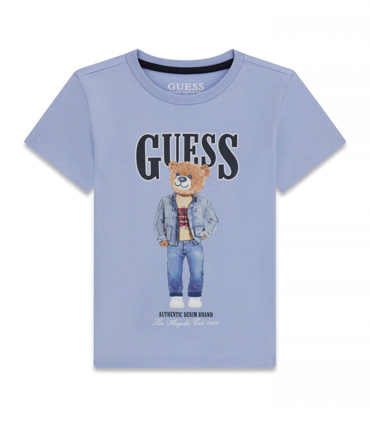 Berniukiniai marškinėliai su linksmu meškiuko iliustracija ir „Guess“ logotipu. Minkštas medvilninis audinys yra patogus ir puikiai tinka kasdieniam dėvėjimui.