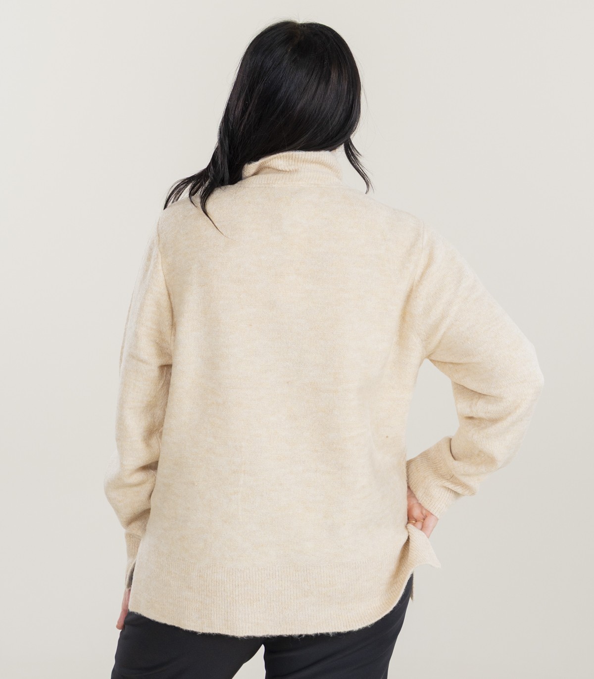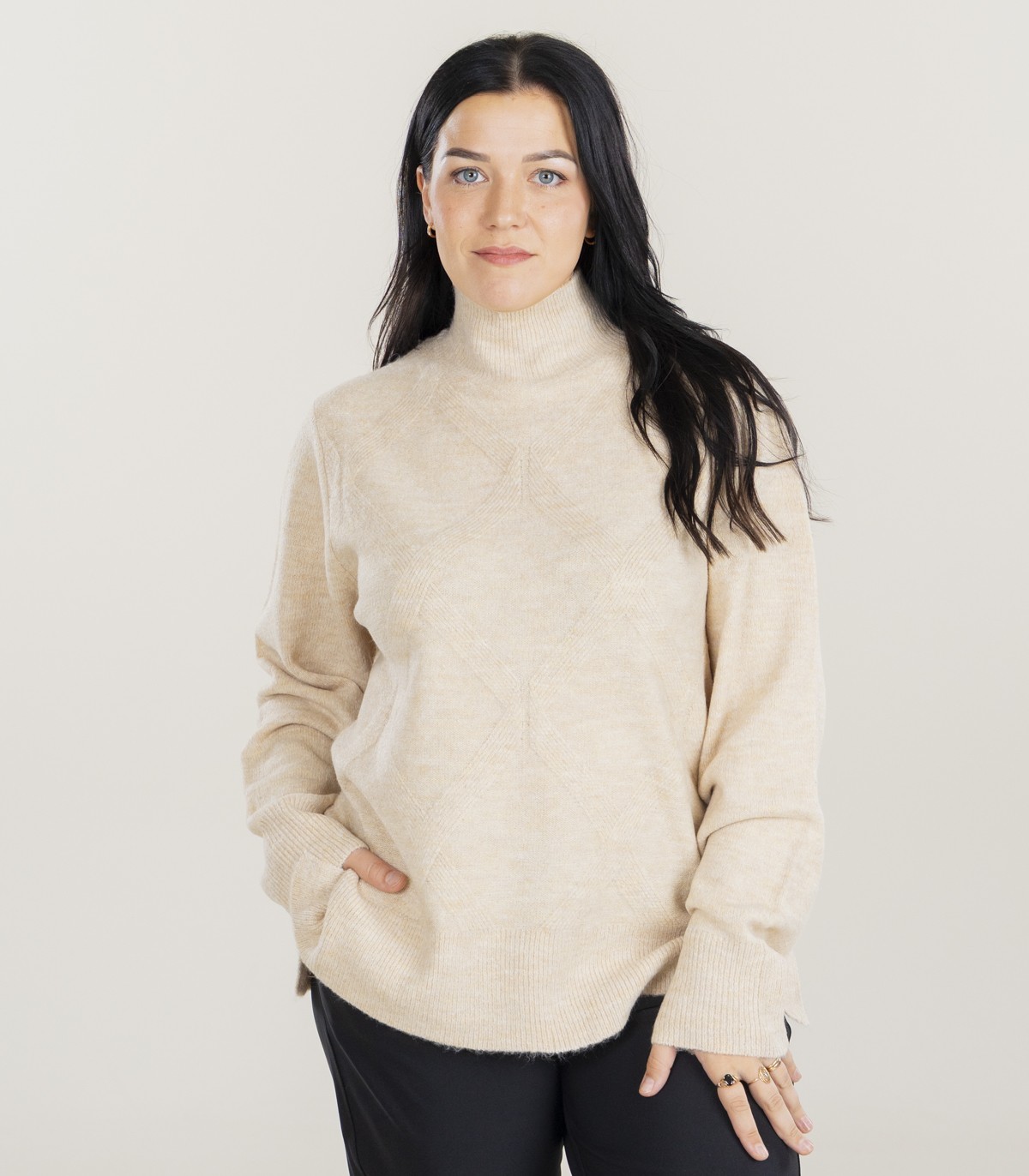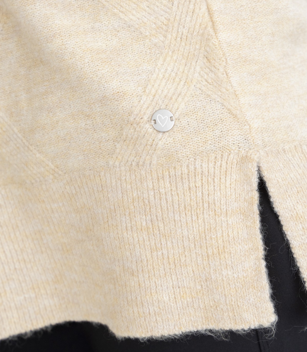 Moteriškas „Zabaione“ megztinis golfu su patogiu kirpimu ir minkštu megztiniu pagrindu. Šviesiai smėlio spalvos atspalvis su neįkyria tekstūra sukuria paprastą ir universalų įvaizdį. Megztinį papildo maža metalinė detalė su širdies formos raštu apačioje ir mažais skeltukais šonuose.