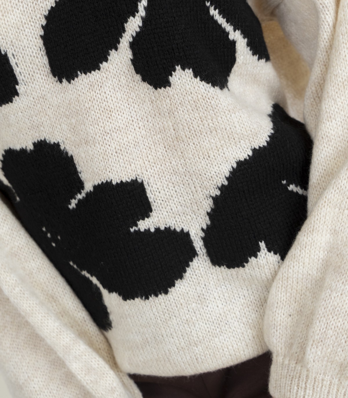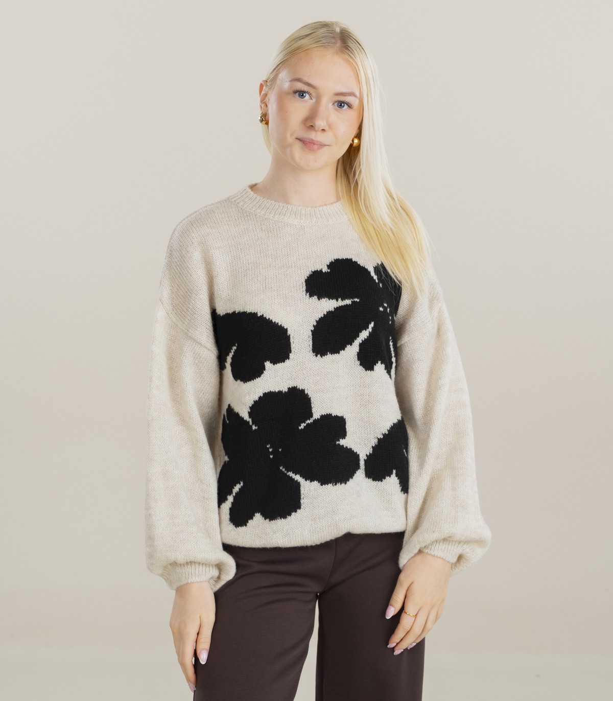 - Didelės kontrastingos gėlės priekyje suteikia ryškų akcentą ir paverčia megztinį išskirtiniu įvaizdžio elementu.