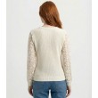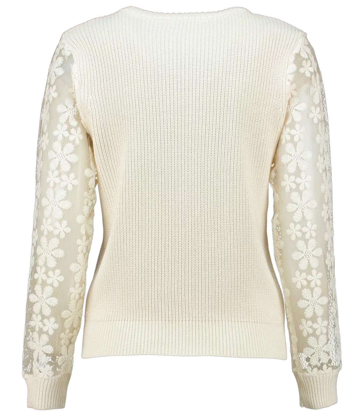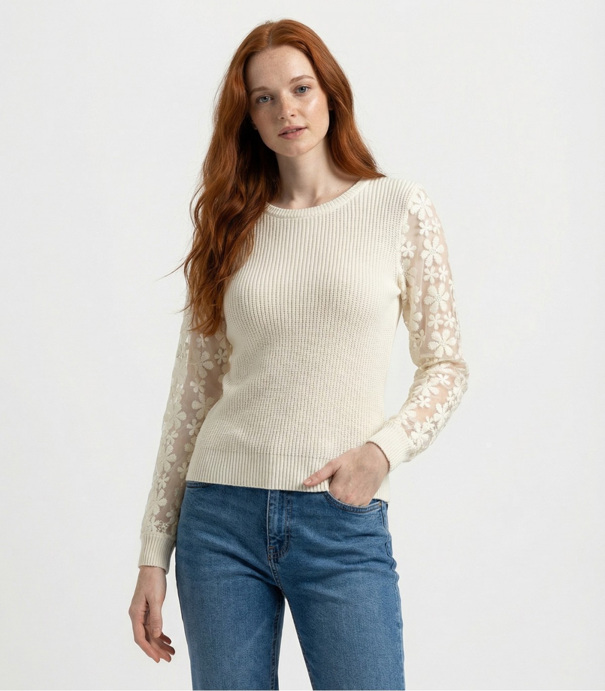 Šis elegantiškas „Hailys“ megztinis pasiūtas iš minkšto megzto audinio ir derina patogumą bei stilių. Išskirtinis jo bruožas – permatomos ilgos rankovės su subtiliu gėlių raštu, suteikiančiu lengvumo ir romantiškumo. Šis megztinis puikiai dera su džinsais, kelnėmis ar sijonais tiek laisvalaikiui, tiek biurui.