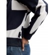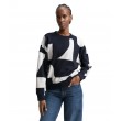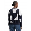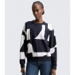 Raštuotas laisvo kirpimo džemperis – puikus pasirinkimas stilingam ir patogiam kasdieniam įvaizdžiui. Didelis kontrastingas tamsiai mėlynos ir baltos spalvos raštas suteikia modeliui išraiškingumo ir modernaus charakterio.