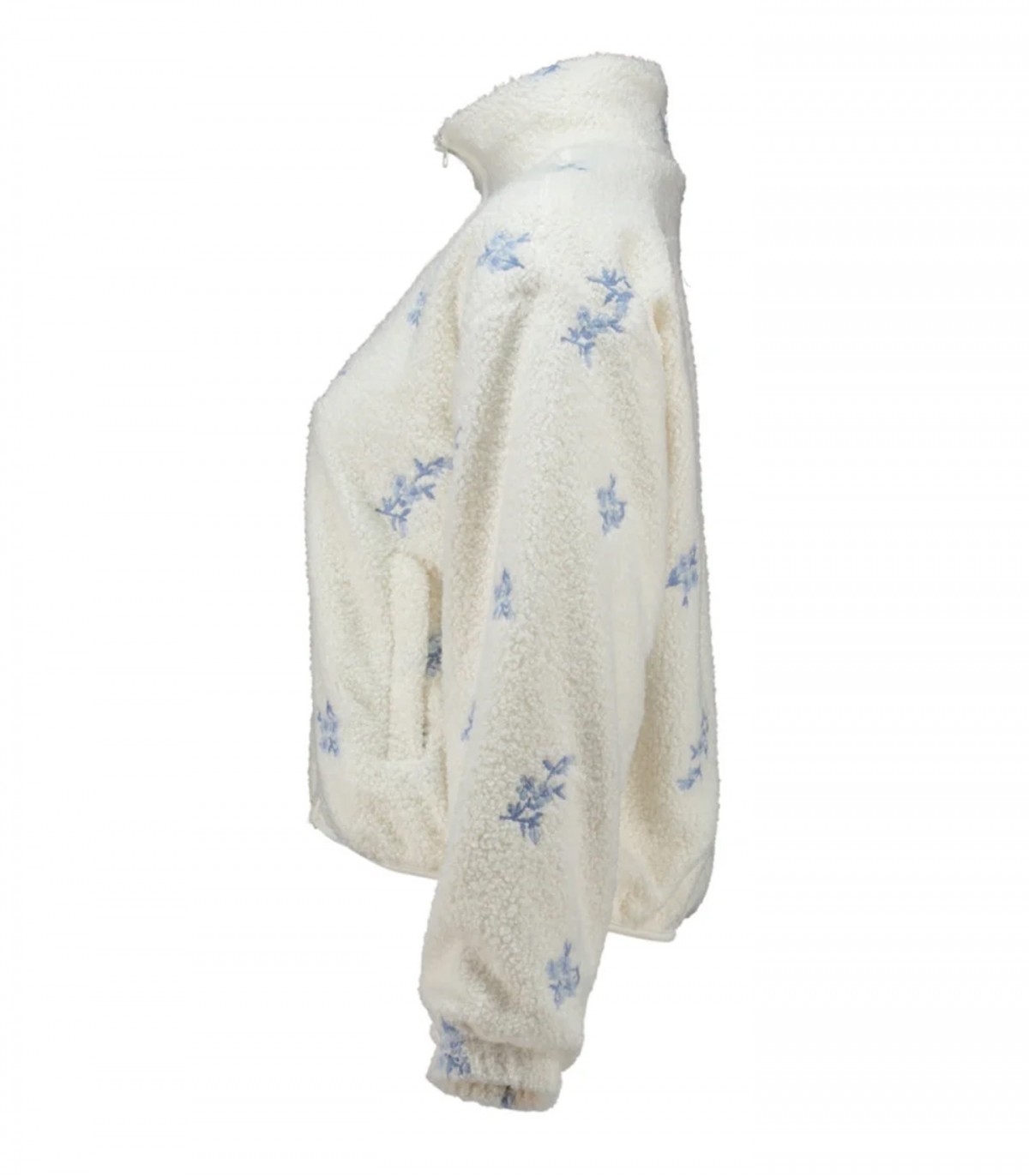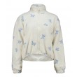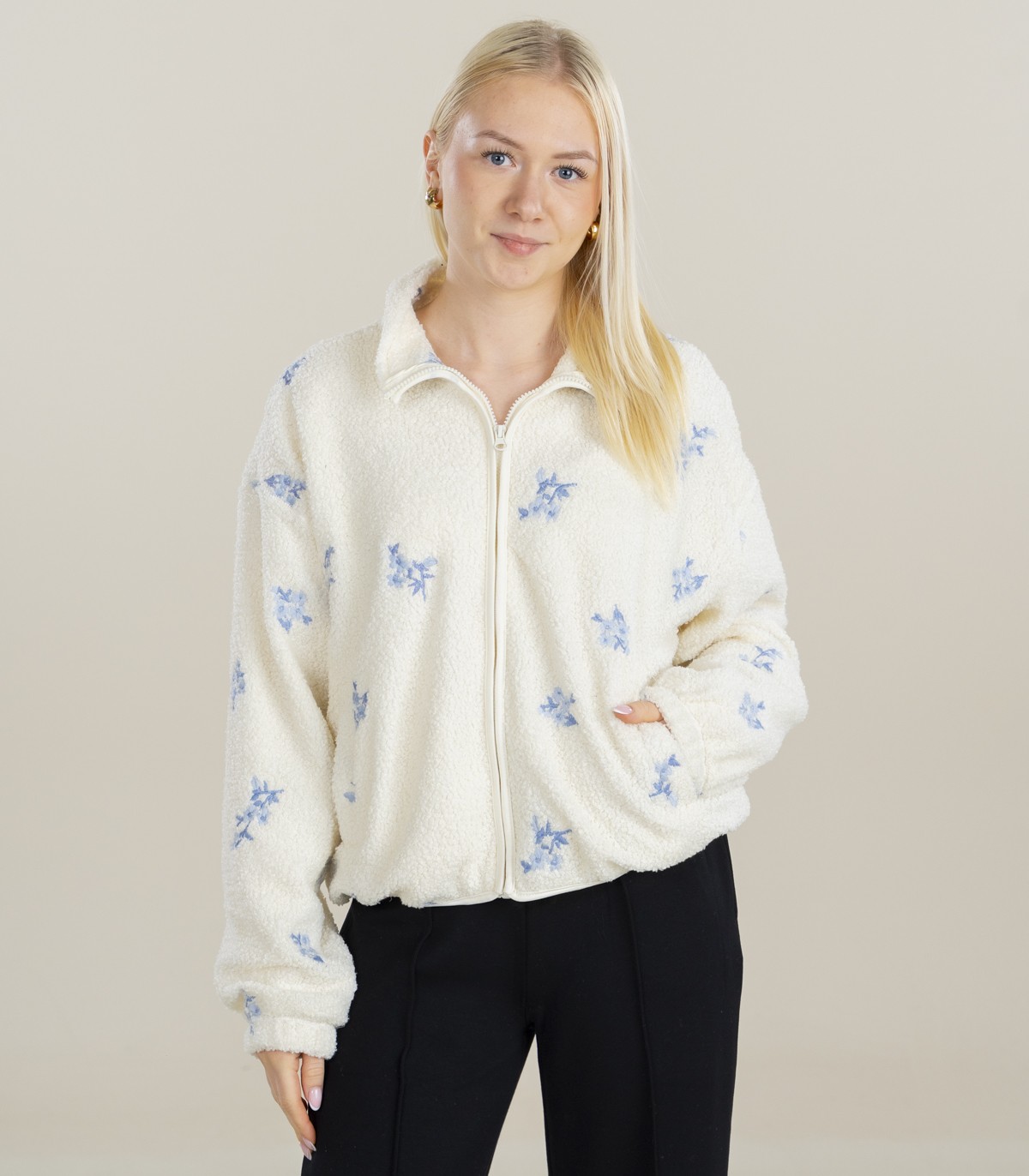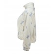 Šis trumpas, prabangus „Hailys“ švarkas su šviesiai mėlynais gėlių raštais derina patogumą ir stilių. Šis laisvo kirpimo, užtrauktuku užsegamas modelis turi šonines kišenes ir tamprią apačią, kad būtų patogu.