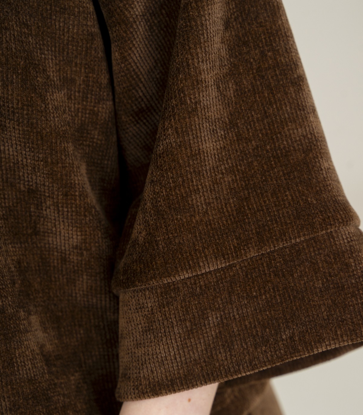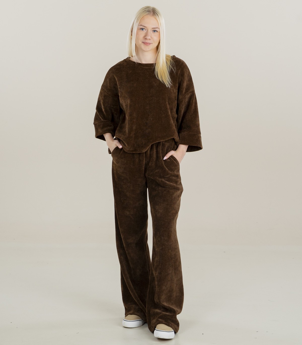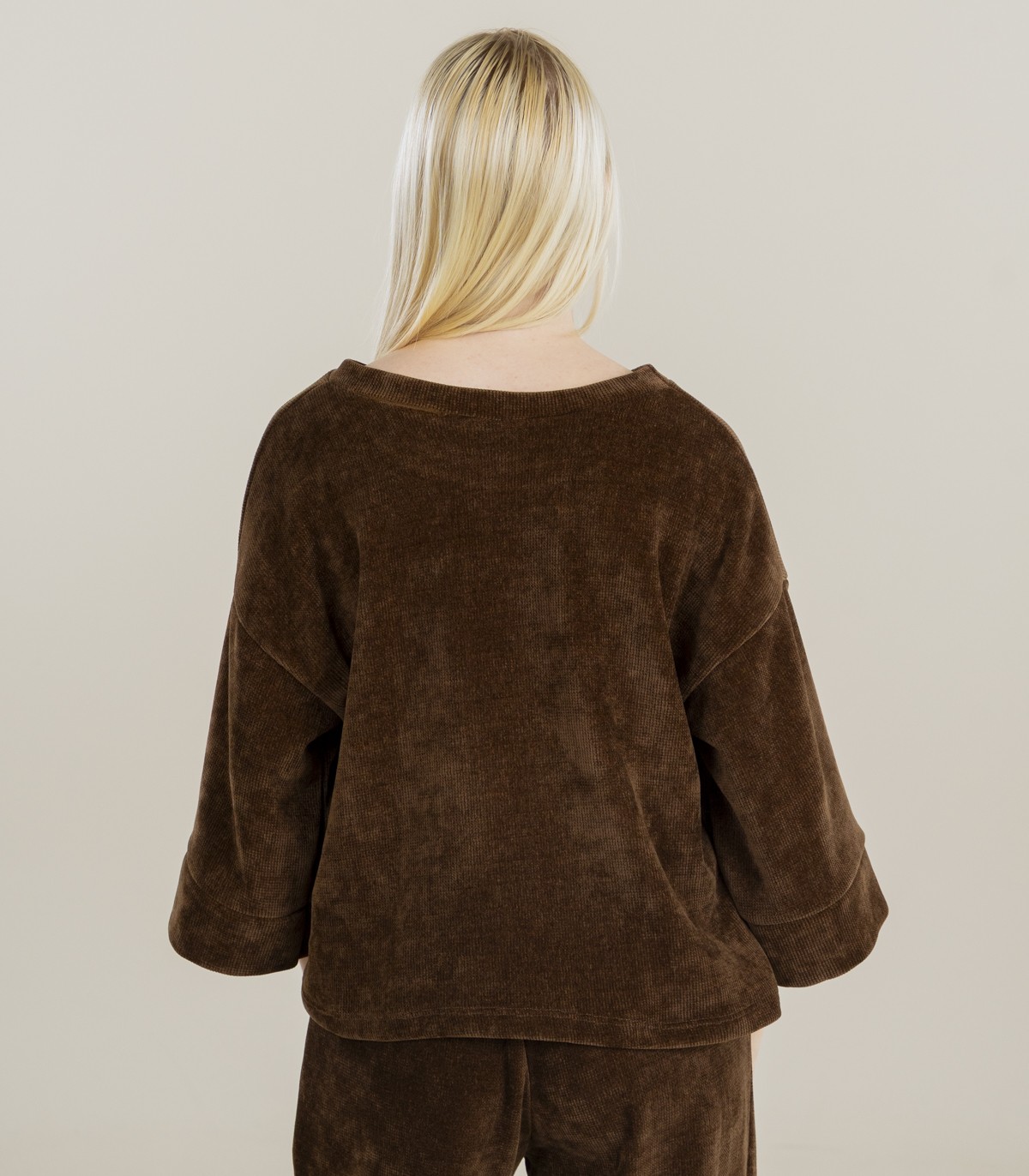 Moteriškas „Hailys“ velvetinis megztinis sukuria jaukų ir modernų įvaizdį. Šis laisvo kirpimo modelis pasiūtas iš minkšto, malonaus liesti velveto audinio. Plačios rankovės ir apvali iškirptė suteikia stilingą ir lengvą įvaizdį.