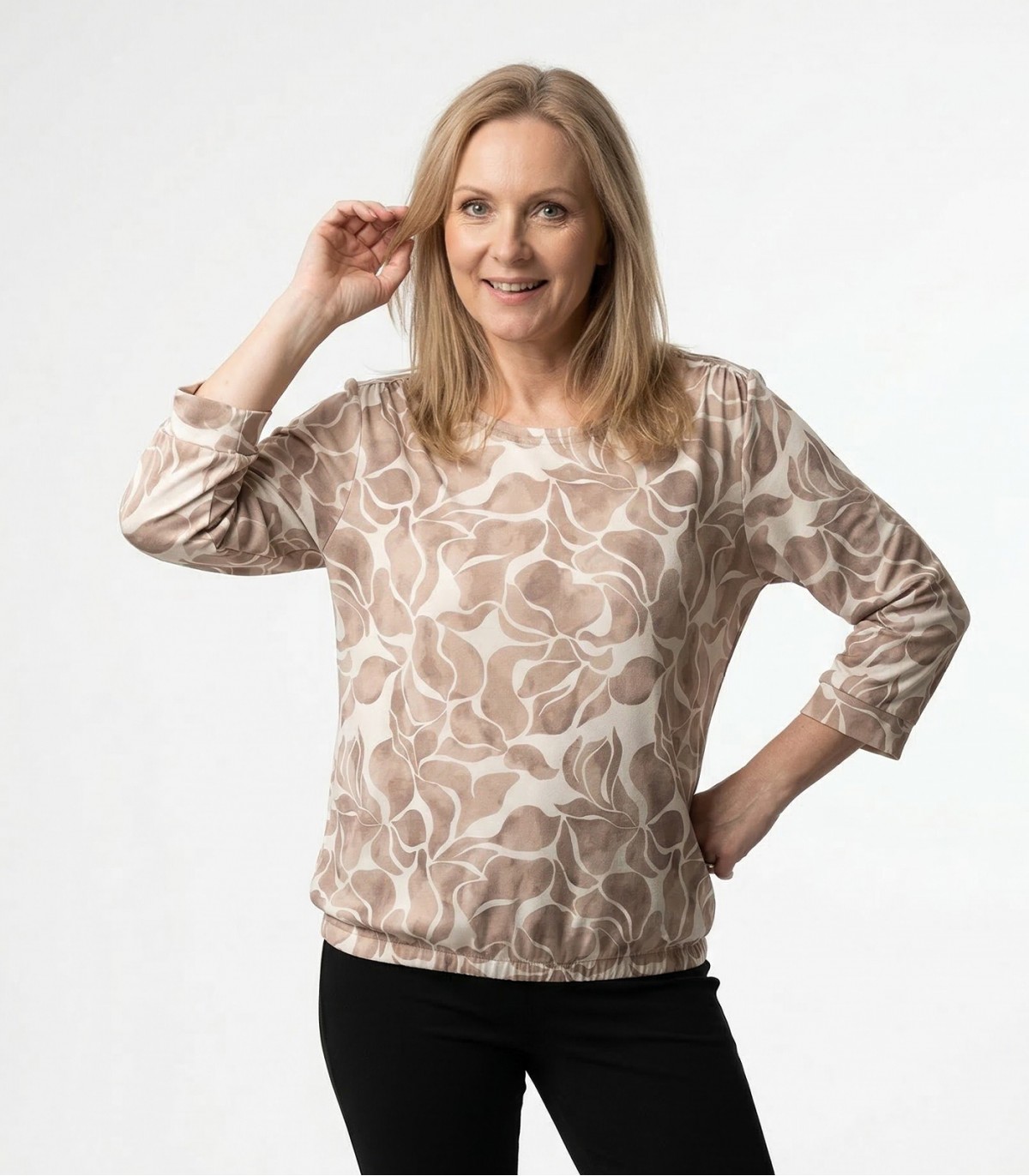 Ši moteriška palaidinė pasiūta iš minkštos, patogios medžiagos, užtikrinančios komfortą visą dieną. Kontrastingas abstraktus raštas suteikia išraiškingumo ir modernumo.