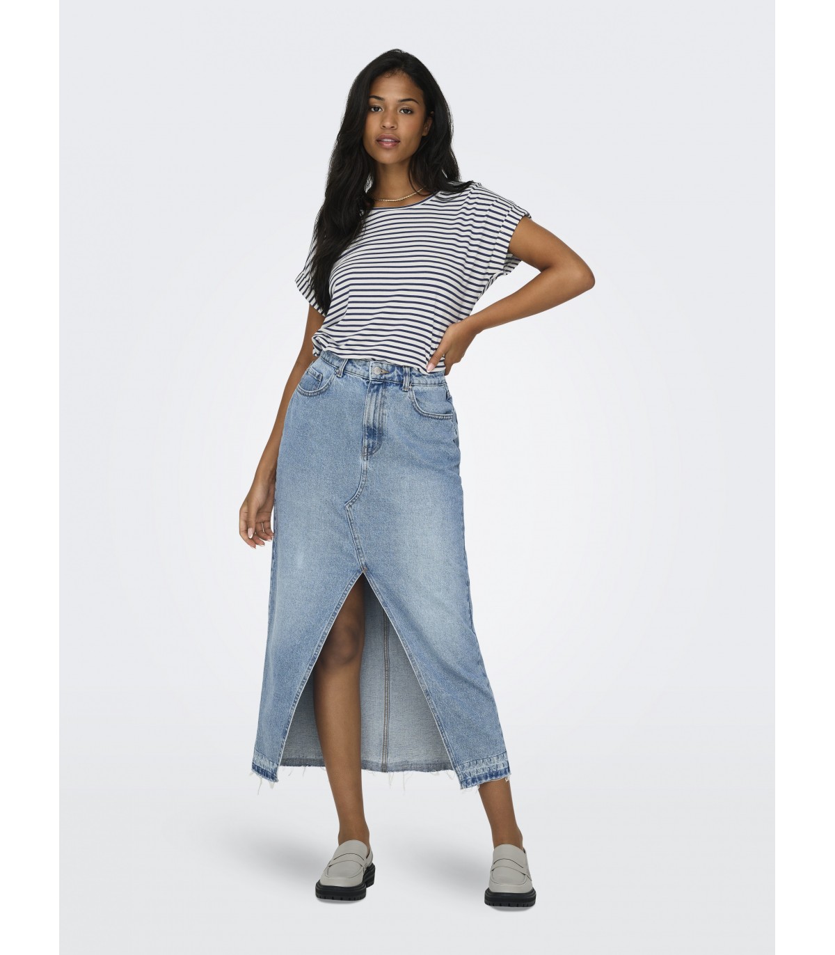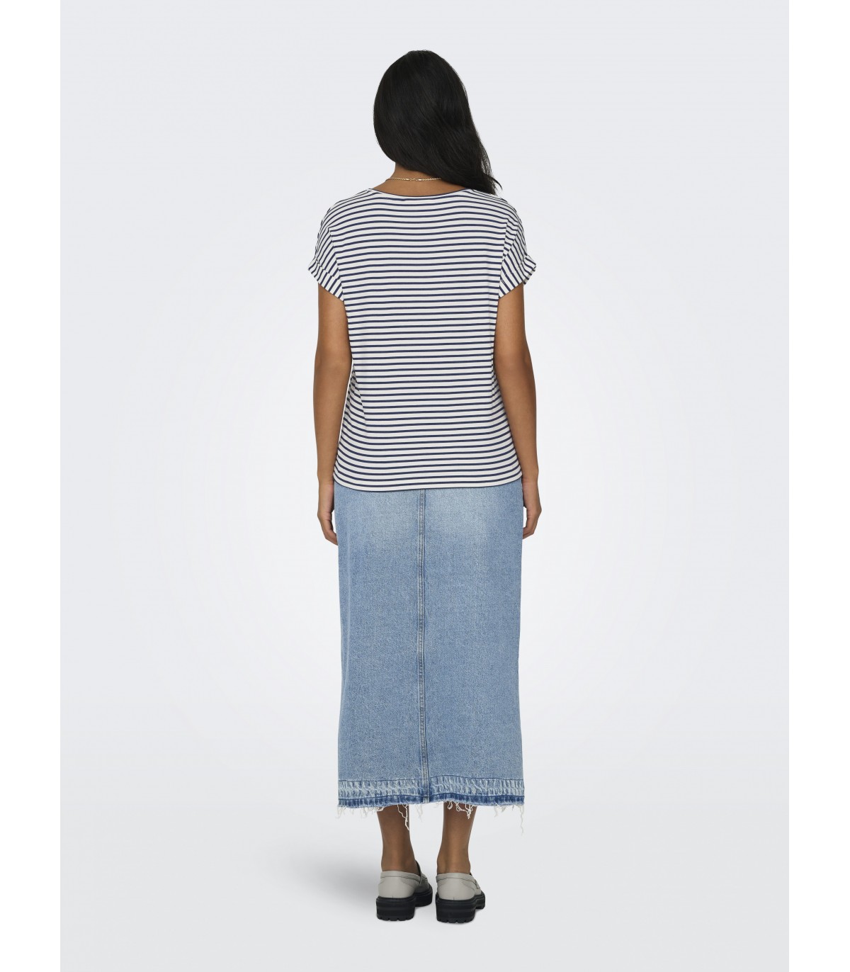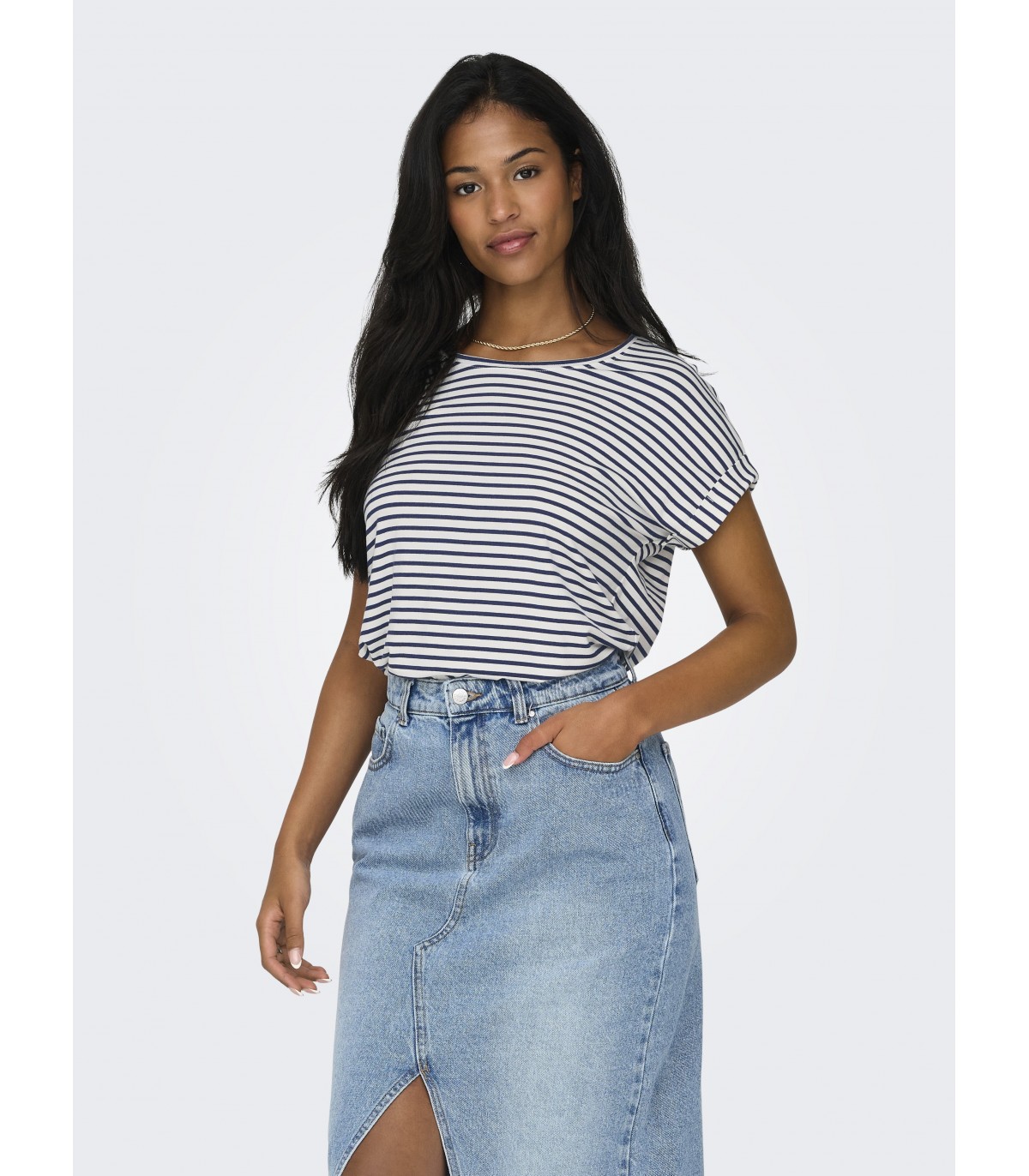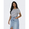 Moteriški dryžuoti marškinėliai iš ONLY prekės ženklo, pagaminti iš minkšto viskozės audinio. Modelis apvaliu kaklu, trumpomis rankovėmis su aukštyn ir nuleistais pečiais. Jis yra standartinis, todėl yra patogus ir tinkamas dėvėti kasdien.